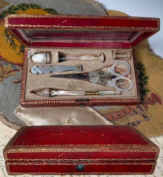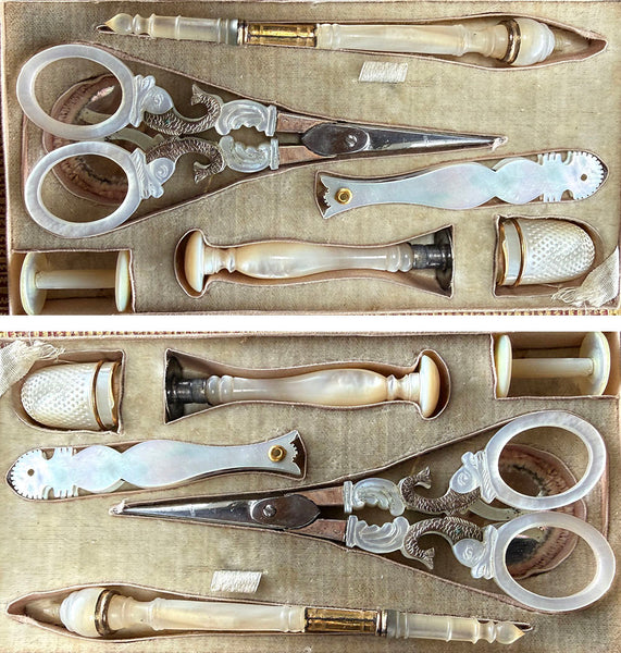 Fine Antique French Palais Royal 18k Mother of Pearl Sewing Nécessaire, Etui, Set Figural Scissors, 7 Tools