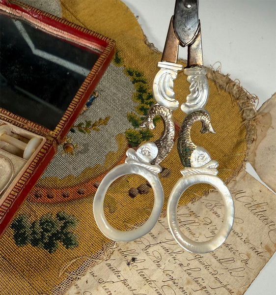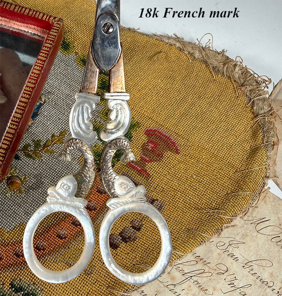 Superb Napoleon I to Charles X Era (c.1810-30) French sewing tools, the old Palais Royal boutique special Nécessaire everyone covets, but this one has some special features. Note the unusual gilded gold foil dolphins carved into the handles, 18k gold and mother of pearl trimmed out with 18k collars, and 18k trim on some of the other sewing implements. Tools: Scissors, spool, silk winder snowflake, crochet tambour/needle case combo (missing the anchor screw), wax seal, vanity tool with ear wax spoon and 3 toothpicks retractable into the mother of pearl handle. Finally, a thimble trimmed with 2 bands of 18k gold, but which has damage (see detail photos for review). There would have also been a bodkin, or lace-threading needle, which has gone missing. Unusual to have a wax seal. I do think the tambour is a replacement tool, slightly misfit for the recess.  The original silvered mirror remains inside without any damage, no chips. The etui itself is beautifully preserved outside and inside, and the padded silk protector and all chenille remains intact. A splendid set! Measurements noted on photos.