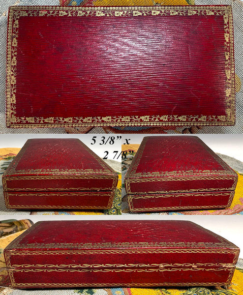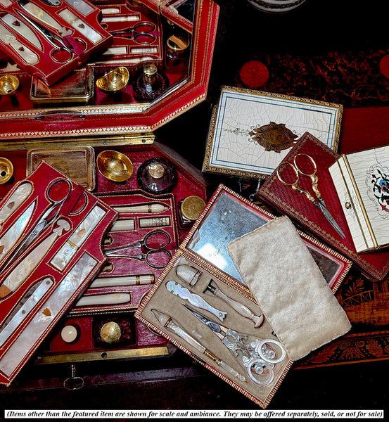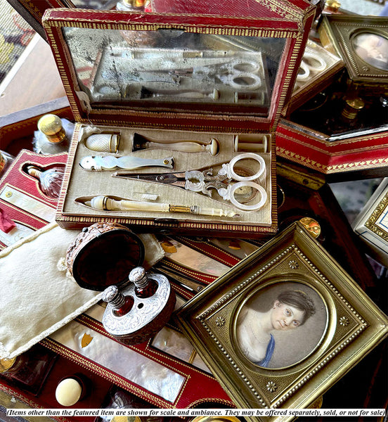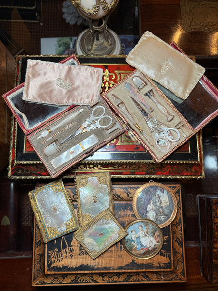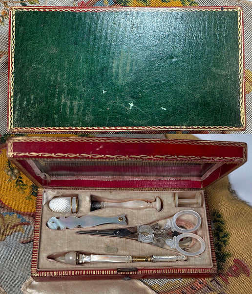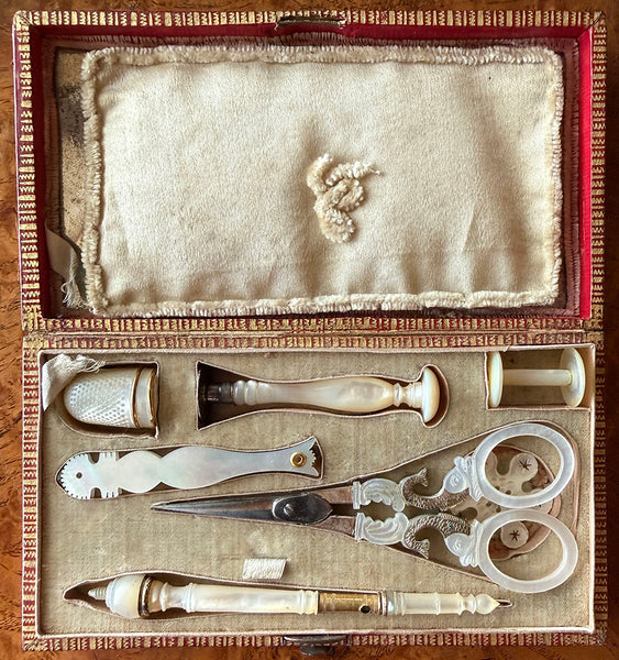 Very good to excellent condition for age and type. These rarely survive without something lost or damaged. Tools: Scissors, spool, silk winder snowflake, crochet tambour/needle case combo (missing the anchor screw), wax seal, vanity tool with ear wax spoon and 3 toothpicks retractable into the mother of pearl handle. Finally, a thimble trimmed with 2 bands of 18k gold, but which has damage (see detail photos for review). There would have also been a bodkin, or lace-threading needle, which has gone missing. Unusual to have a wax seal. I do think the tambour is a replacement tool, slightly misfit for the recess.  The original silvered mirror remains inside without any damage, no chips. The etui itself is beautifully preserved outside and inside, and the padded silk protector and all chenille remains intact. Hinge and clasp each working perfectly, a clean interior. A splendid set!