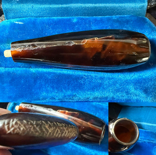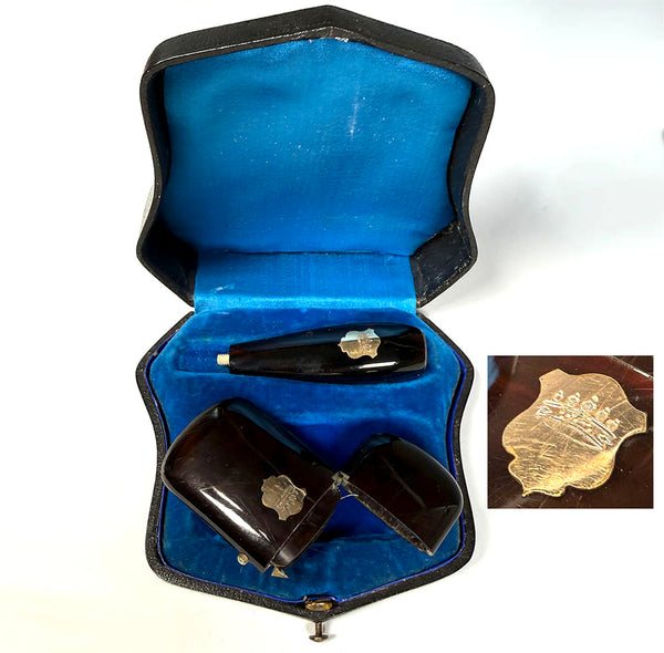 Not perfect, but beautiful to display, and certainly could be used. I see it in store display at a fine cigar store. Each piece (cigar holder and match vesta) in dark chocolate tortoise shell mounted with a monogrammed 18k gold crest with crown monogram, meaning the set was originally made for a titled person. In France, it's not legal to use a crown unless rightfully entitled by title. On bottom is a store's paper etiquette (label), so we know it was initially purchased in Nimes, France. Full measurements noted on photos.
