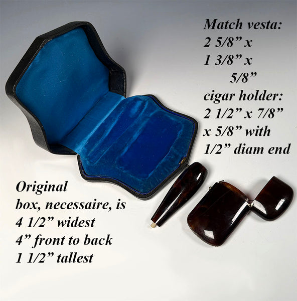 Very good to excellent condition for age and type. NAPOLÉON III (Victorian) era, possibly slightly later, Belle Epoch luxury. The box is superb inside and out. The match vesta is excellent for age, striker along the bottom. That elegant cigar holder is flawed, however. On the underside, one can see a long hairline from being dropped, I suppose. Perhaps the mouthpiece broke at that time. Likely it was an ivory mouth piece. The mount for it remains and I suppose replacements can be ordered, though I'm not sure where. If you're a cigar dealer, or smoker, you'll know. Price discounted due to the holder.