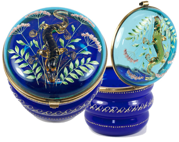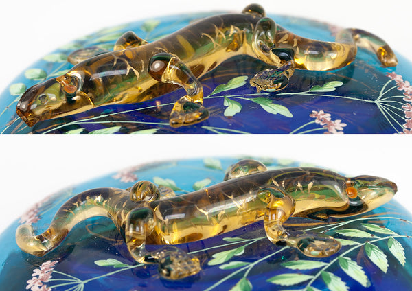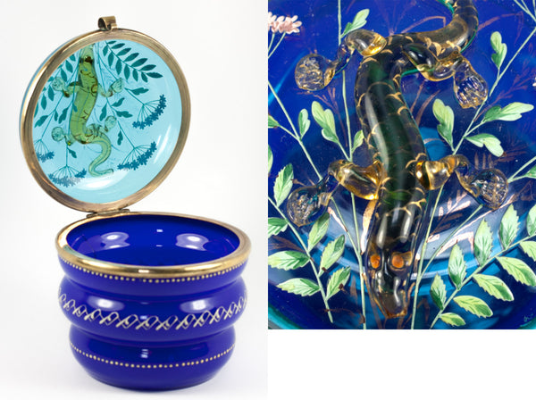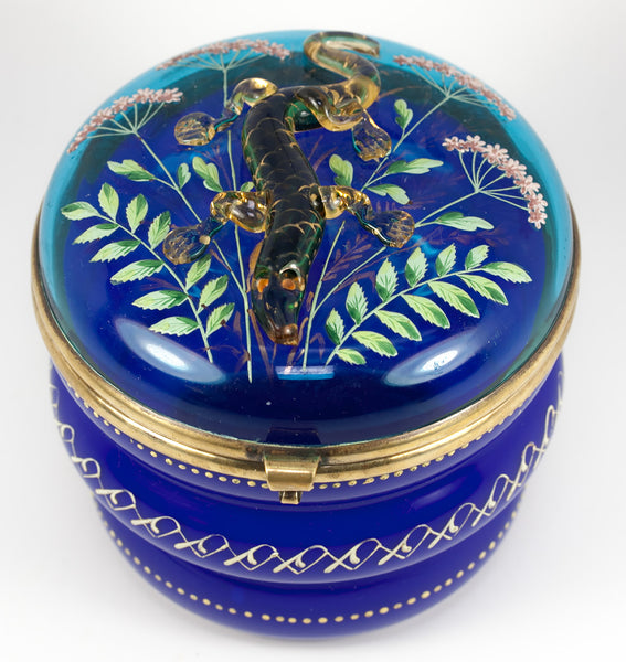 In the Museum of Decorative Arts, Prague, (and other museums) you'll find wonderful old 19th century Moser items like this one - glass salamanders, frogs, snakes on Art Nouveau natural scenes that are painted on with kiln-fired enamels. They are rarely signed, but are noted in the museums as Moser, so we are certain this one is also a Moser glassware arts piece. Superb quality and important piece, this will anchor any collector's display, and is large at 5" diameter, 5" high when closed.