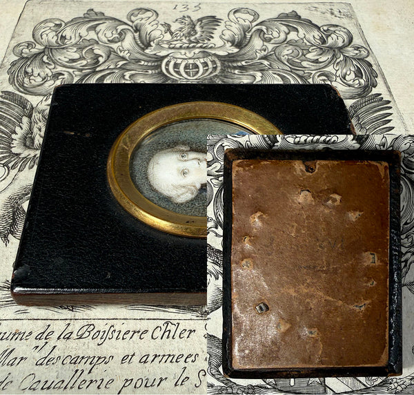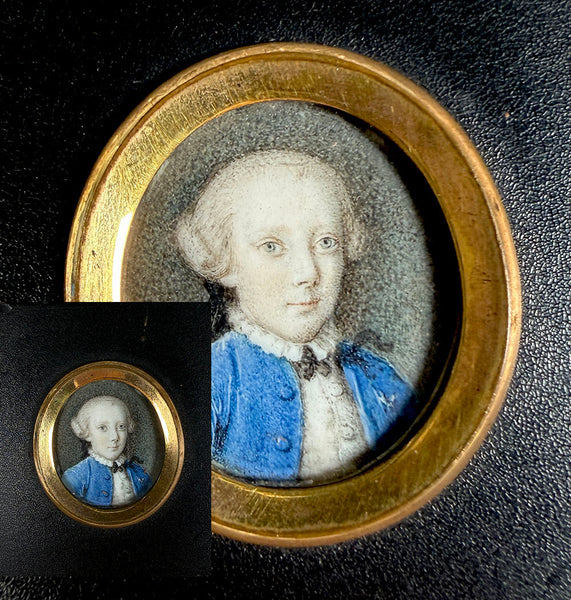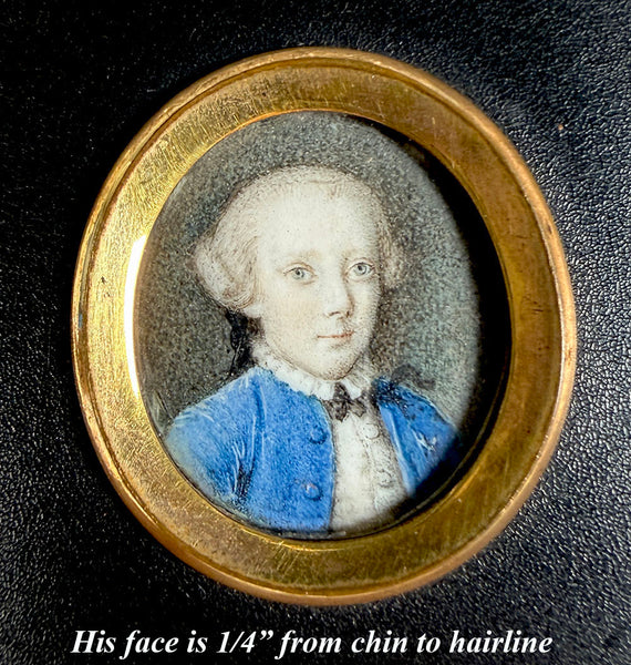 One of the tiniest portrait miniatures in my collections, this frame is just 2.5" tall, and his face is only 1/4", yet look at the personality, those blue eyes and the perfect attention to detail of his clothing and hair. Dates easily to c.1750-70. The very early ones like this are usually quite small in size, easily tucked into a vest pocket. This is a young boy, approximately 8-10, child of nobility. Full measurements noted on photos.