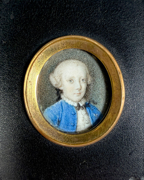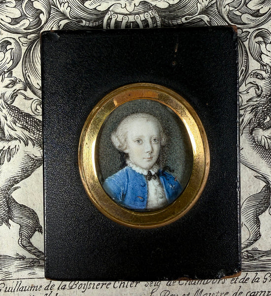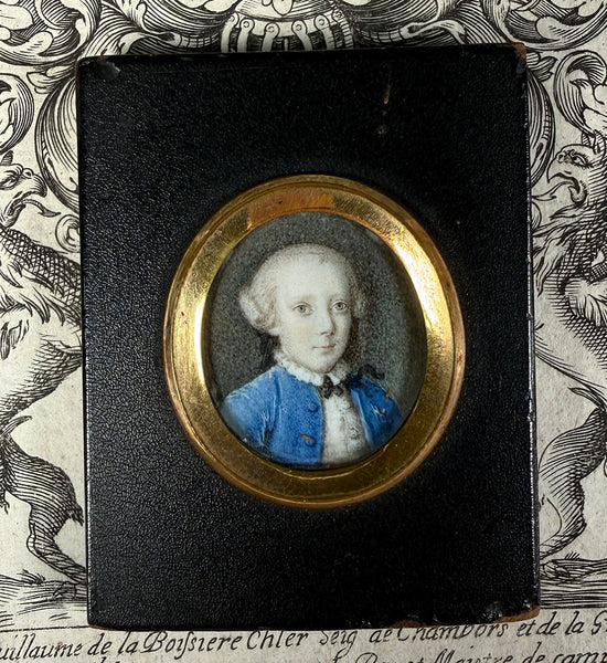 Tiny Antique French Portrait Miniature, Boy in Blue with Powdered Wig, c. 1750s