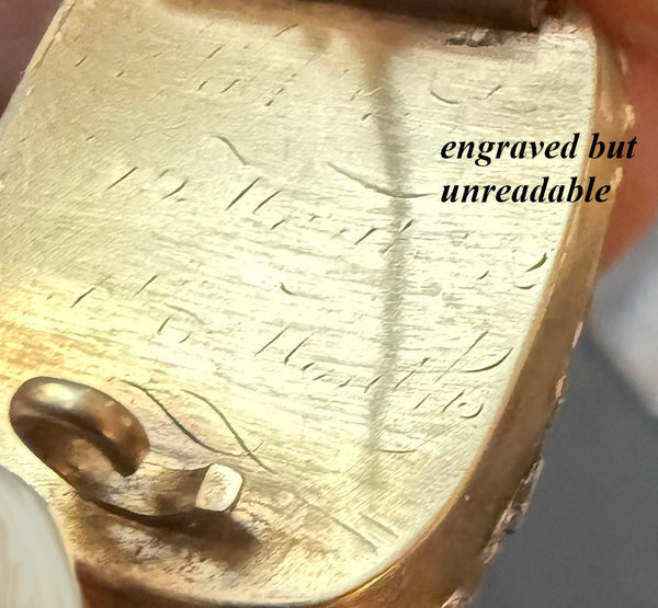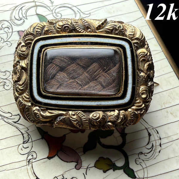 From my own collections of decades: Antique 12k Gold and seed pearl hair art mourning brooch, c 1780s to 1820, Georgian Era. Total weight: 5.18 grams. Double row of kiln-fired enamel highlights the plaited hair memento within. Plaiting of dark blond hair, and engraving on back but impossible to read. I sometimes use these grouped on a jacket lapel, or clasped over a strand of pearls - so many compliments!