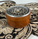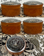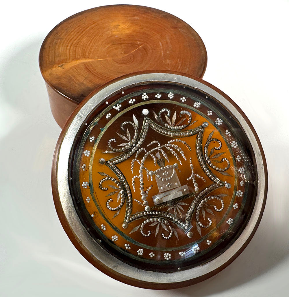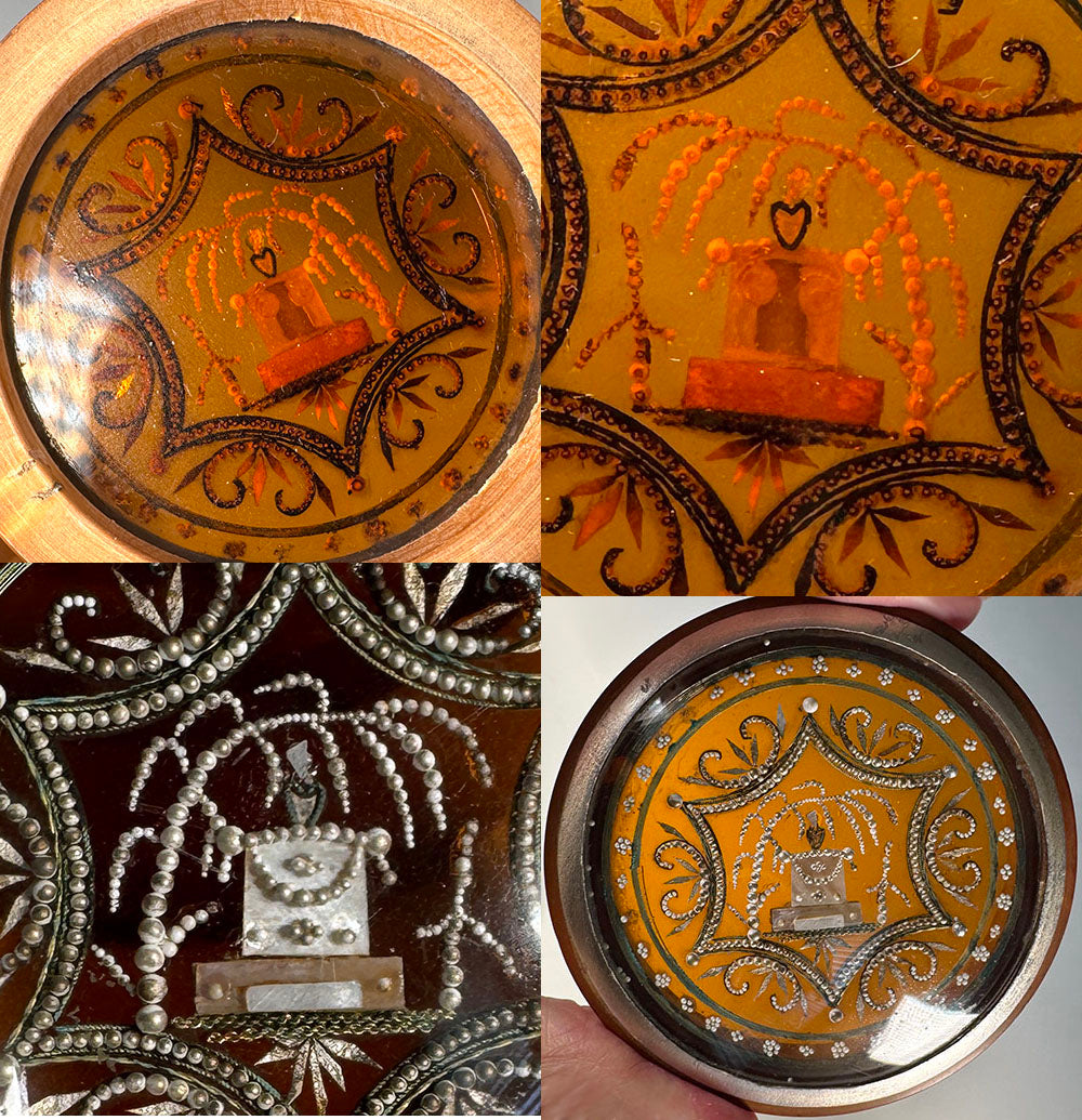 The iconography might help explain why this 250 or so year old snuff shows no sign of use, and is also in nearly immaculate condition. There in center of the worked seed pearl and gold ornamentation worked on boiled horn is a tomb with a heart atop it. Love and loss, it would have 'remembered' someone very dear who died. Seed pearls were iconographic as the tears of the mourner, as well in that time. Isn't it spectacular! a mourning memento, either a snuff or perhaps made to hold a rosary since there isn't a typical liner of shell. Deep domed or bombe cover glass and silver mount combine to make this a museum quality antique. Full measurements noted on our photos.