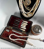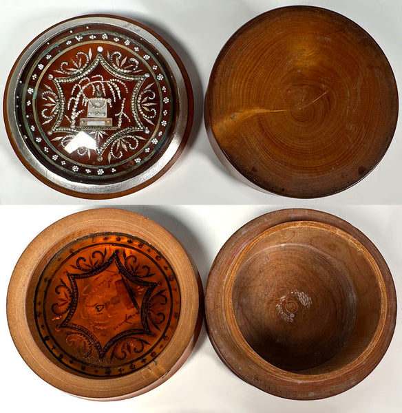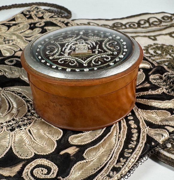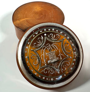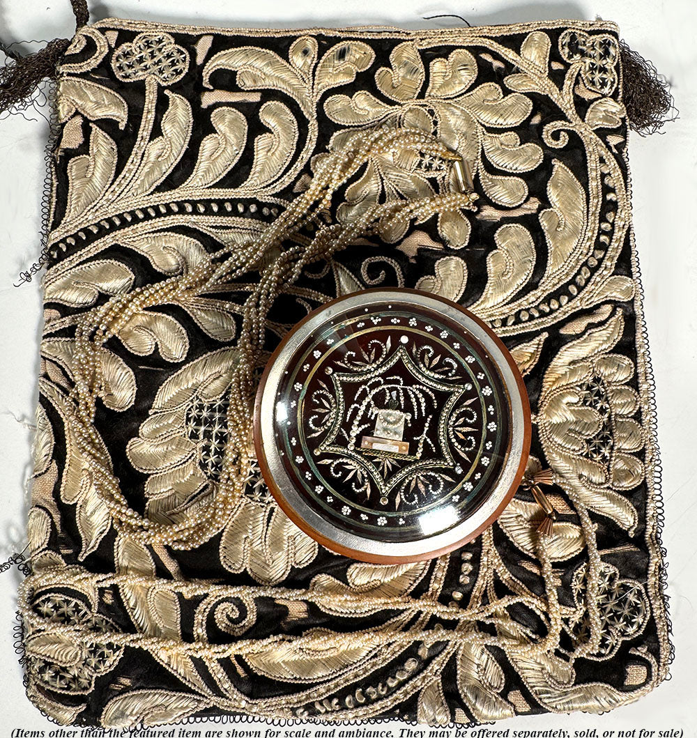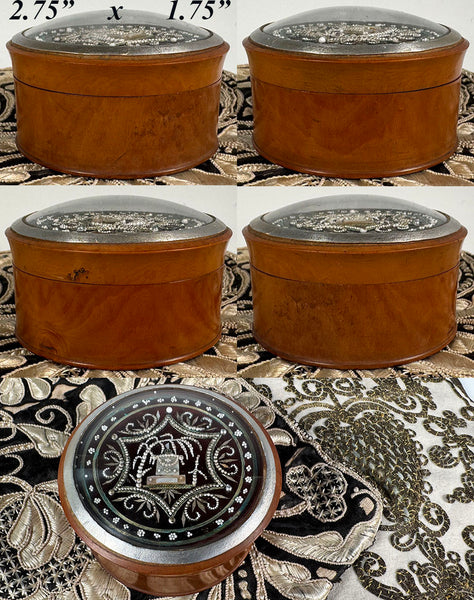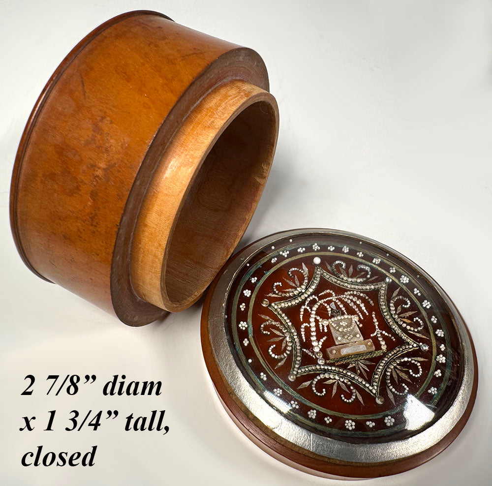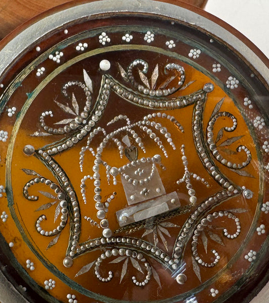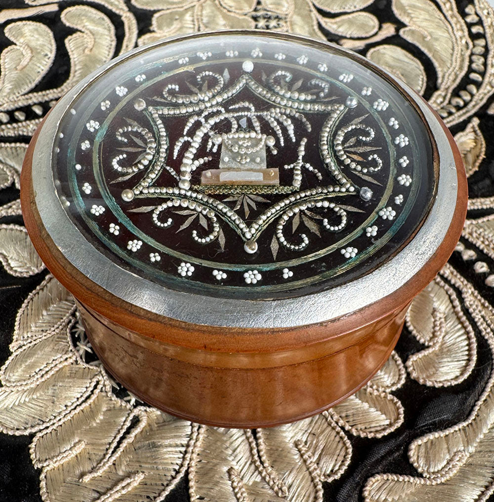 Very good to excellent condition for age and type, no chips or cracks in the wood or boiled horn, or the cover glass and the myriad of tiny 1mm to 2mm seed pearls within are nearly all intact and in place. Rare fine piece, this!