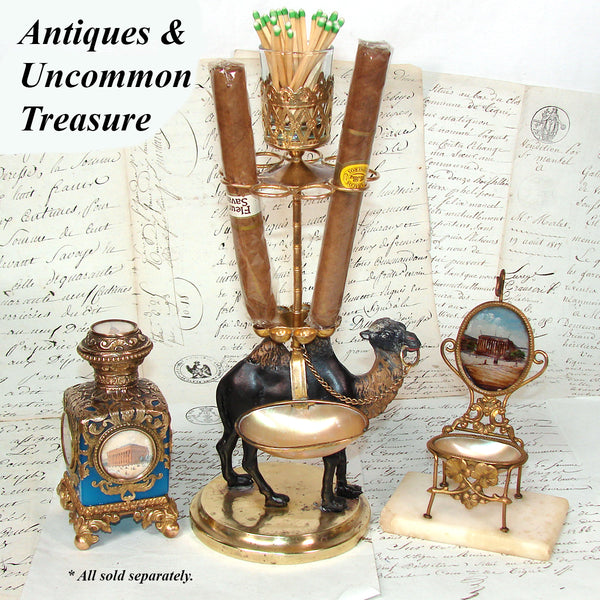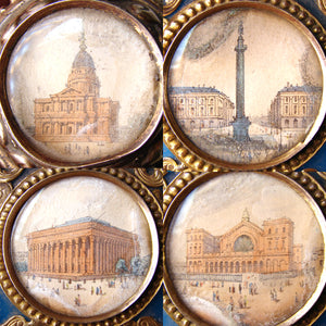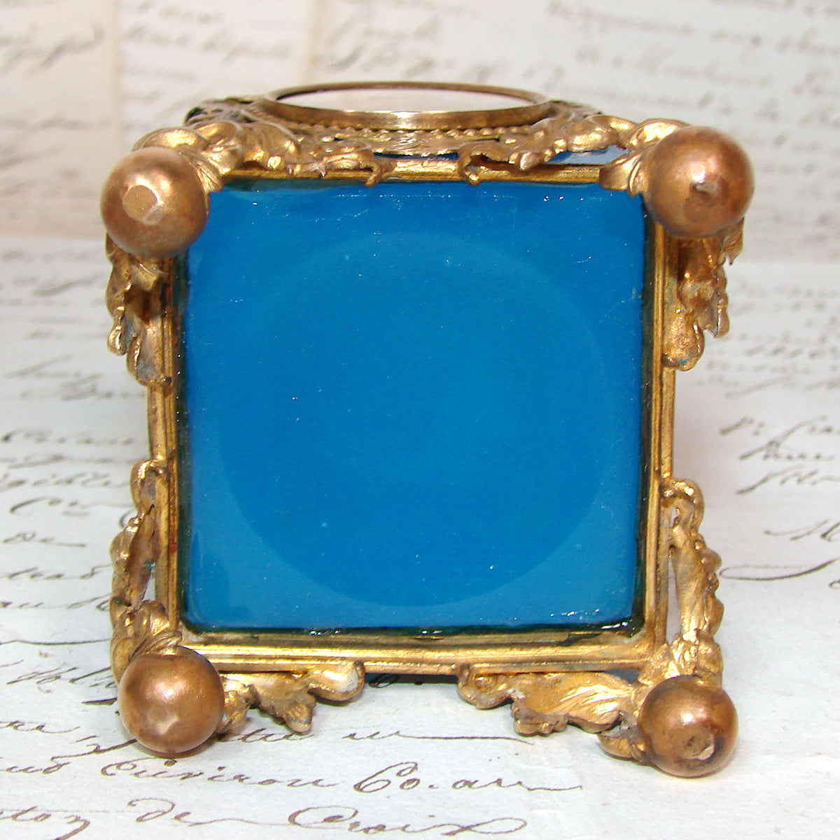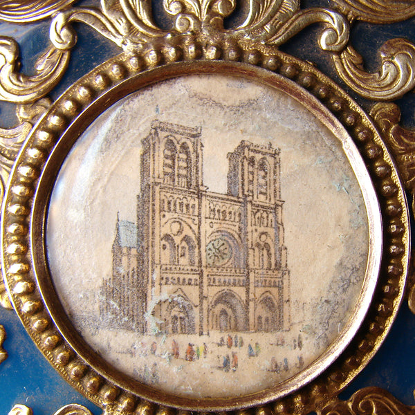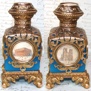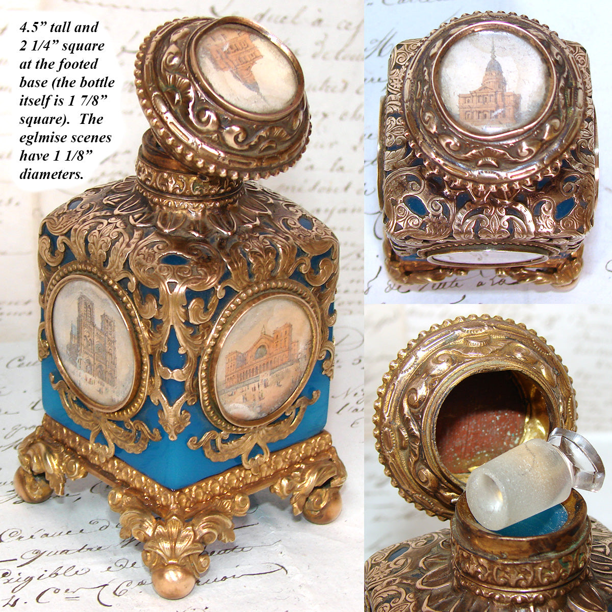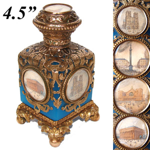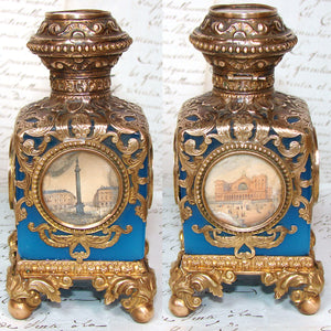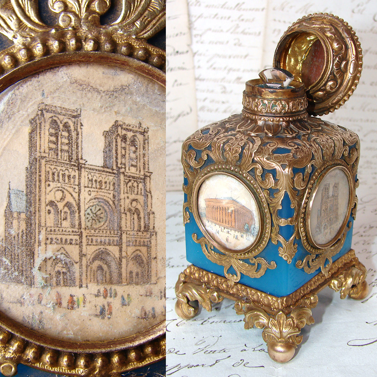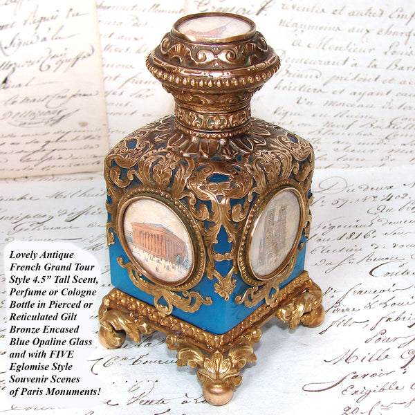 Fabulous and rare Antique French Napoleon III to Belle Epoque era blue opaline glass scent bottle, fully shrouded in pierced or reticulated brass or glided bronze and complete with FIVE souvenir Parisian landmarks including the world famous Notre Dame cathedral, Napoleon's Pillar in Vendome, Bourse and the Hotel des Invalides + !  One of several charming 1800s souvenir items we currently have available, this one with what appears to be Grand Tour style prints on card rather than the back-painted glass (eglomise) or hand painted views of monuments of Paris (though they are hand colored), all under the original drop beveled or slightly convex glass. All iconic architectural monuments of Paris.  Thick opaque blue opaline glass under the pierced brass or bronze shroud and it even has the original glass stopper intact.  A wonderful piece, don't miss it!