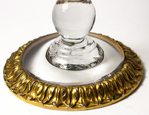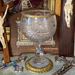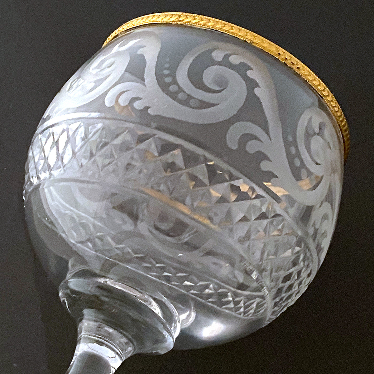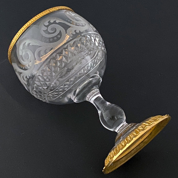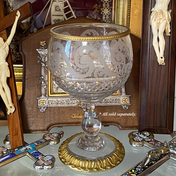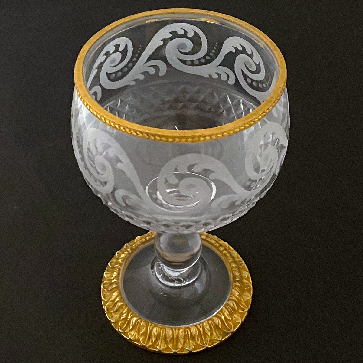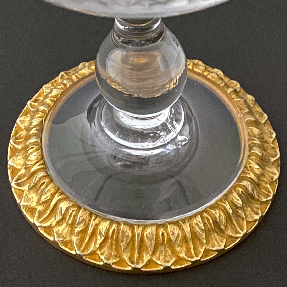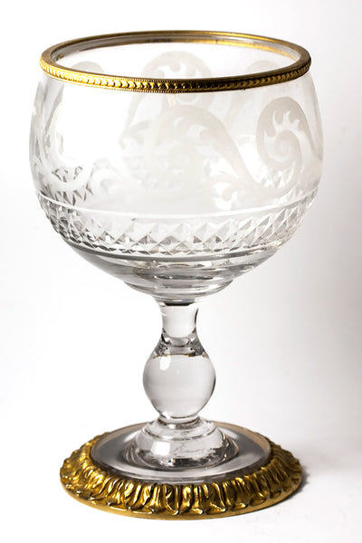 Elegant antique French marriage goblet, centerpiece, or rose vase, standing at a substantial 8 1/4 inches tall. Its form suggests a piece intended for display and special occasions. The goblet features a gilt bronze footed base and rim, indicating a touch of luxury and sophistication. The use of gilt bronze, an alloy of copper with a golden color achieved through gilding, speaks to the craftsmanship and value placed on such objects.  The glass body of the goblet is adorned with a wheel-cut cross-hatch design. This technique involves using rotating abrasive wheels to carve intricate patterns into the glass surface, creating a textured and visually appealing effect. The Louis XIV style intaglio engraved decoration is particularly noteworthy. Intaglio is a method where the design is cut into the surface, and in the Louis XIV style (referencing the reign of the "Sun King" in France, 1643-1715), we can expect to see classical motifs, perhaps including scrolling acanthus leaves, laurel wreaths, masks, or stylized floral elements. These designs would have been meticulously engraved, showcasing the skill of the artisan.
