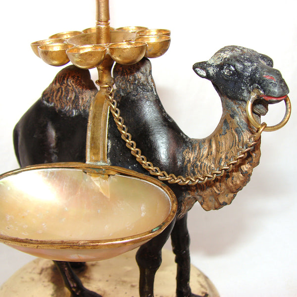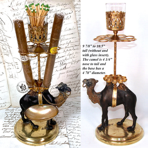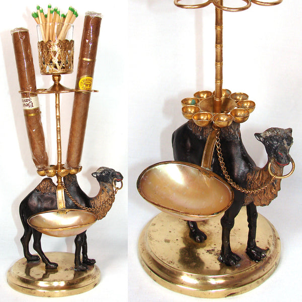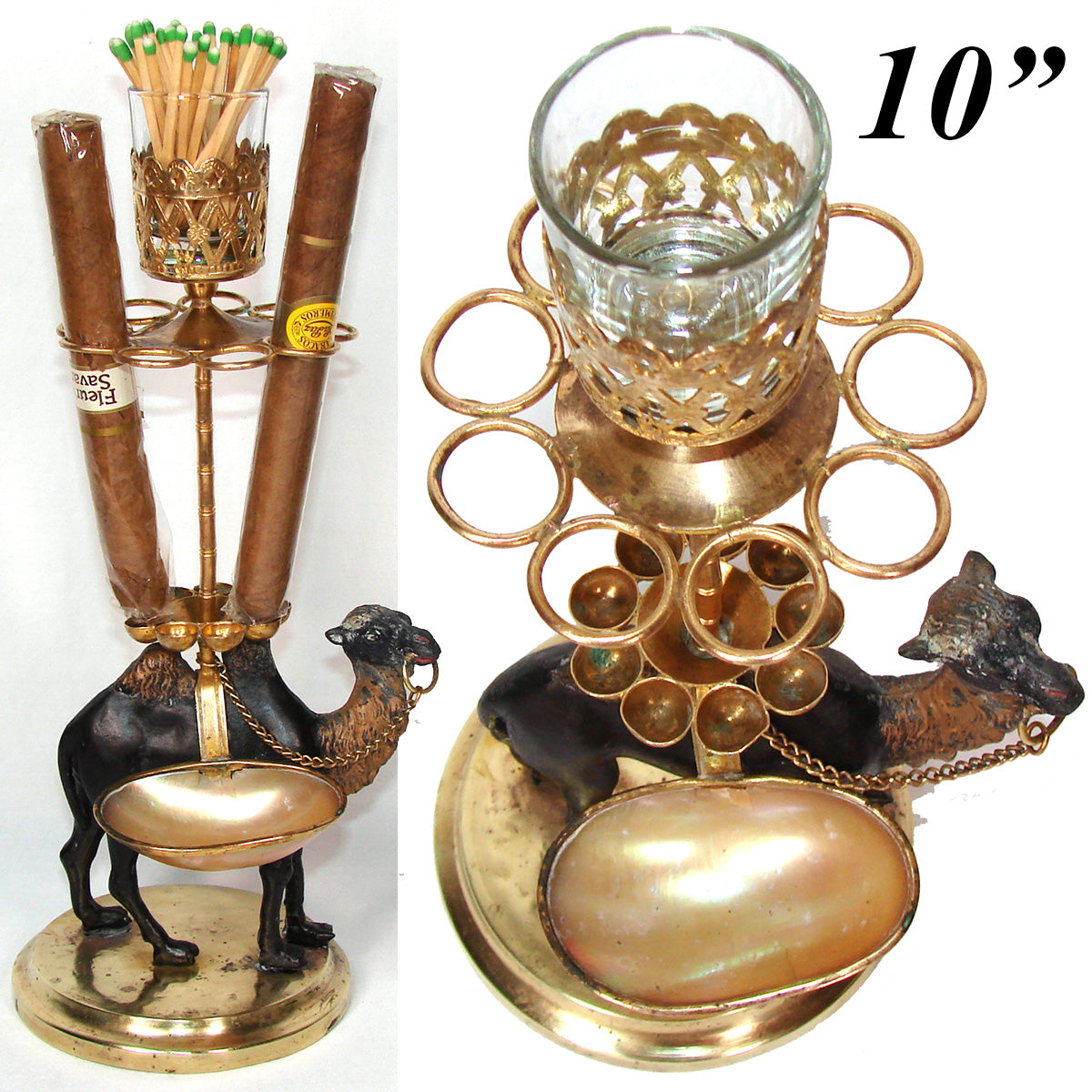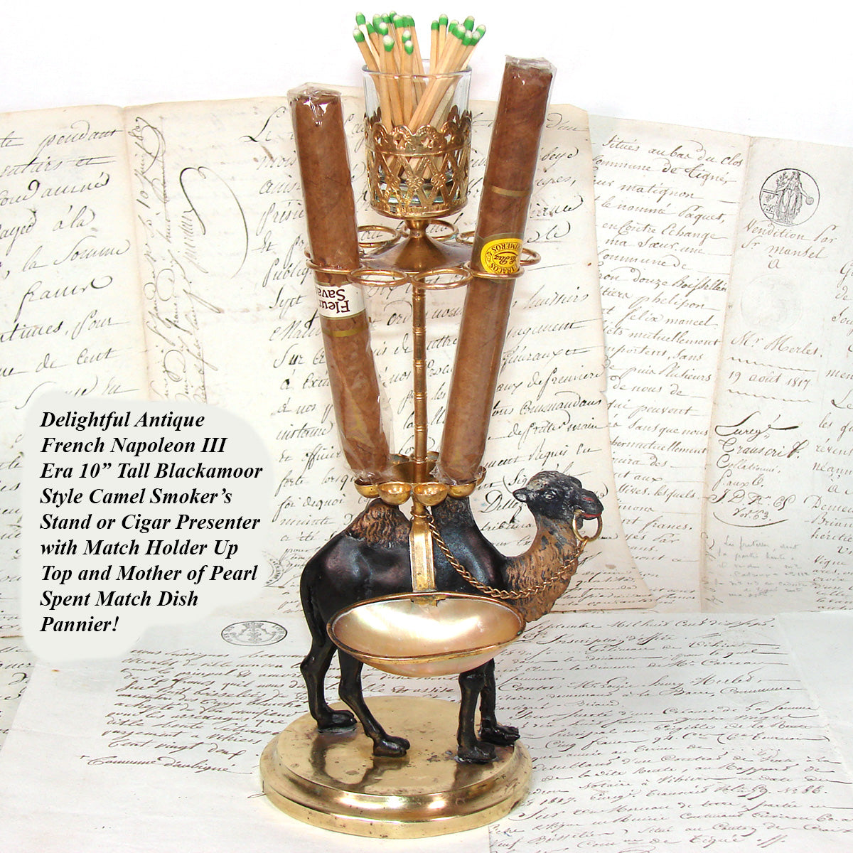 Delightful antique French Victorian or Napoleon III era 10 tall blackamoor style camel, a smoker's stand or cigar presenter with match holder up top and mother of pearl half "egg" spent match dish pannier!  A cold or tole painted camel figure, mostly in black with antique gold accenting, ring and chain from muzzle to the pannier fitting.  The small glass cup in the top surely for matches, the mother of pearl dish likely meant as a receptacle for the spent matches.  The fittings hold up to nine roughly 1/2" cigars.  Remarkable in its rare function, we've had these in the past that held liqueur barrels with collections of small cordial or goblets, this one for cigars and as fine as can be!