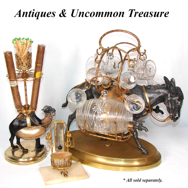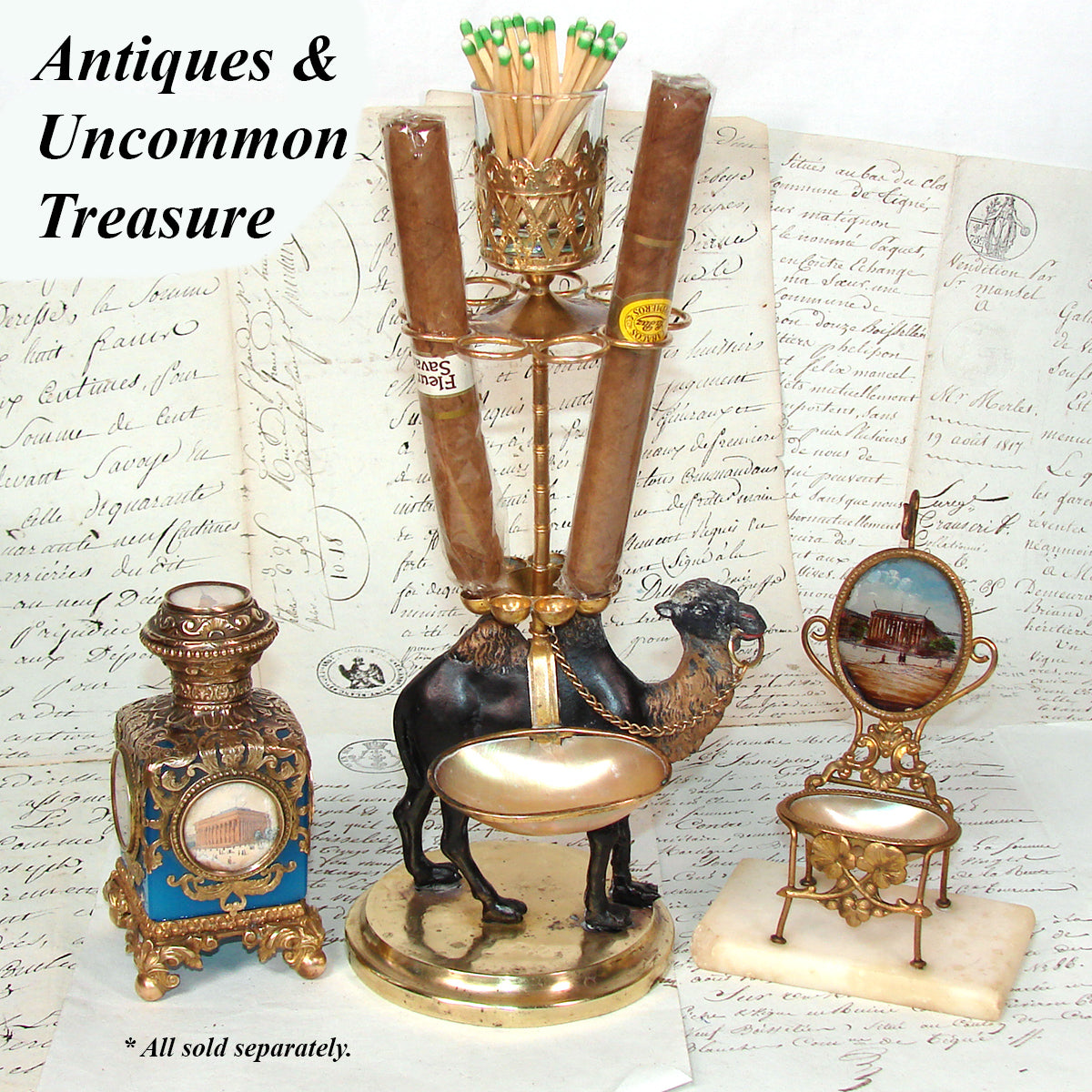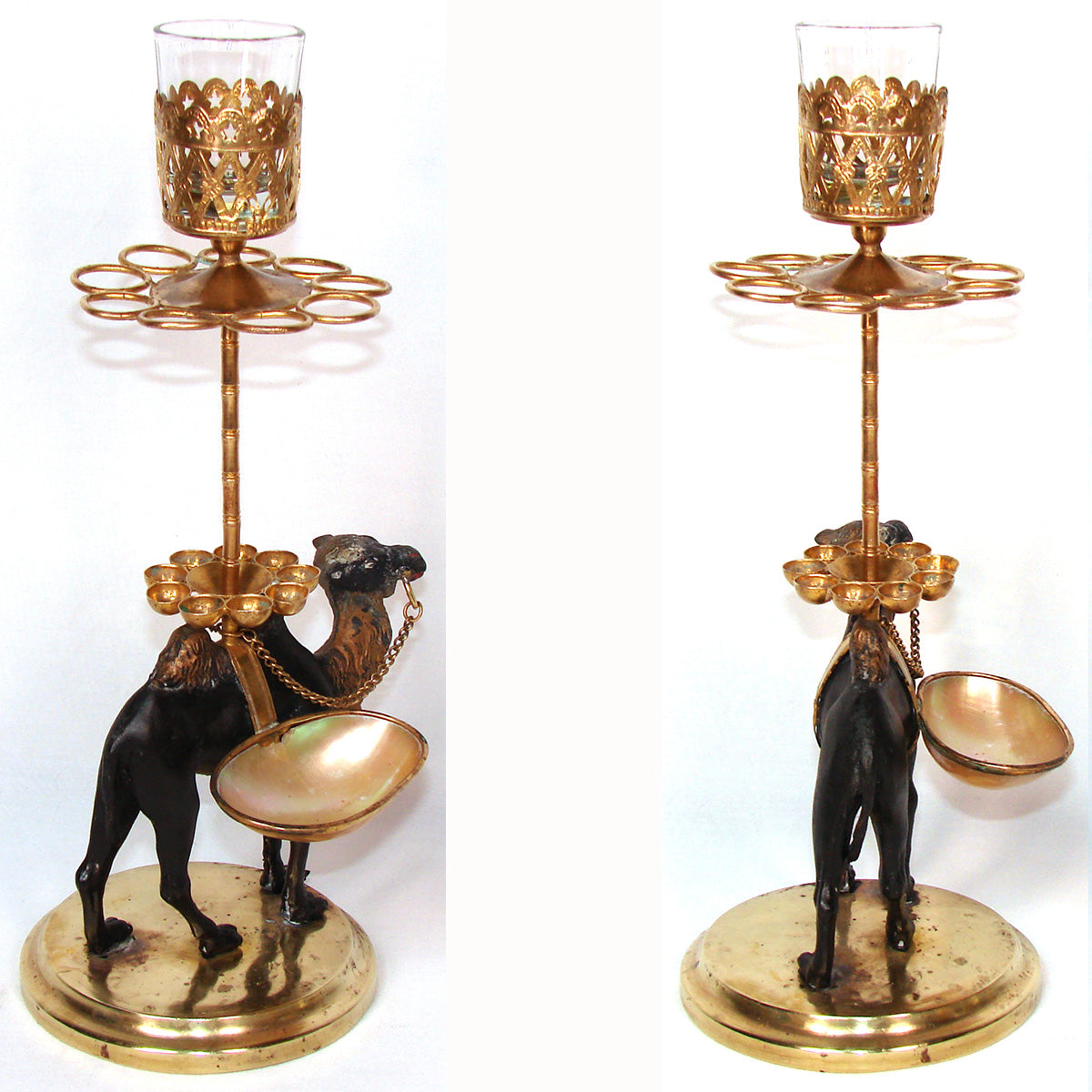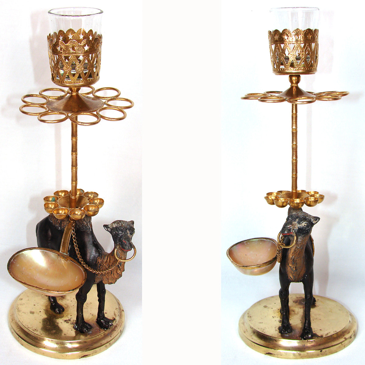 Delightful antique French Victorian or Napoleon III era 10 tall blackamoor style camel, a smoker's stand or cigar presenter with match holder up top and mother of pearl half "egg" spent match dish pannier!  A cold or tole painted camel figure, mostly in black with antique gold accenting, ring and chain from muzzle to the pannier fitting.  The small glass cup in the top surely for matches, the mother of pearl dish likely meant as a receptacle for the spent matches.  The fittings hold up to nine roughly 1/2" cigars.  Remarkable in its rare function, we've had these in the past that held liqueur barrels with collections of small cordial or goblets, this one for cigars and as fine as can be!