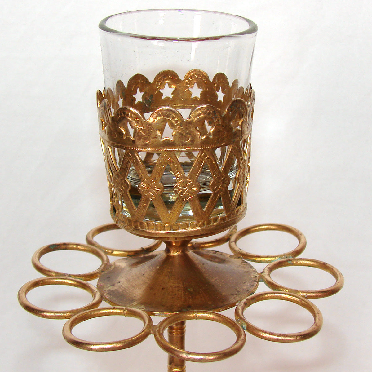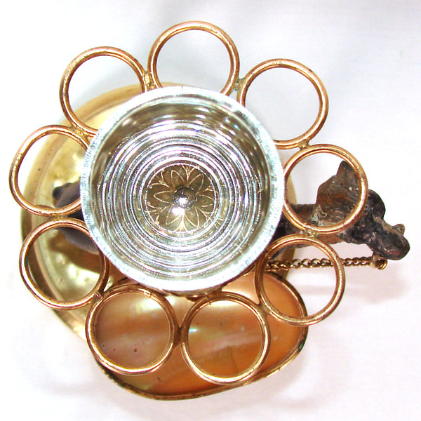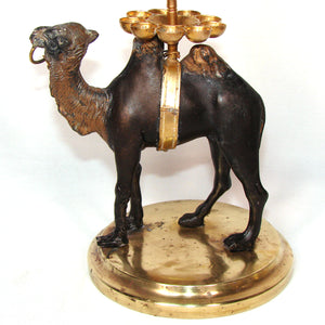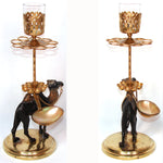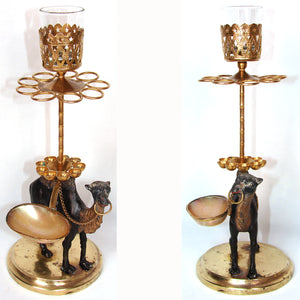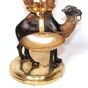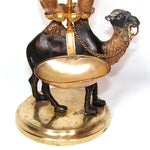 Very good condition.  The glass cup is a later replacement and there is a small chip/crack to the mother of pearl dish where it meets the strap over the camel's back but it's secure.  Some wear, fading or age to the black & gold finish on the figure and some age/tarnish spots to the brass base/plinth.  The base is weighted with plaster, the black has been restored there.  See pictures for all measurements.