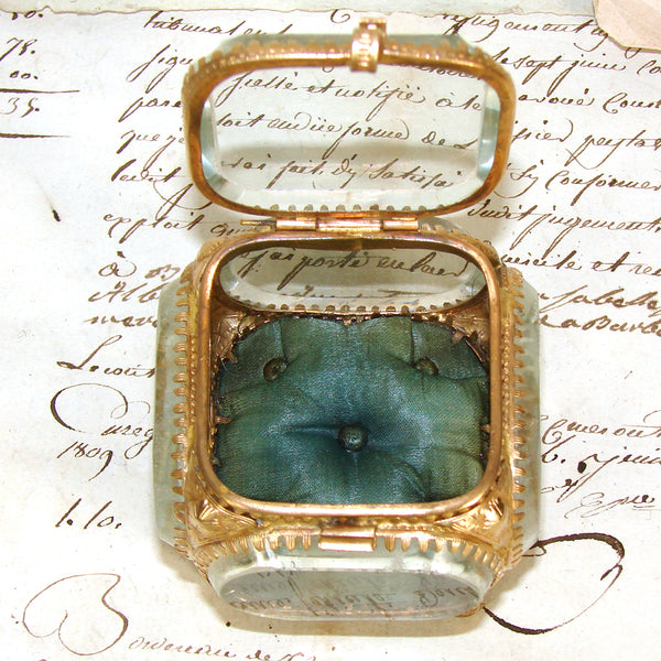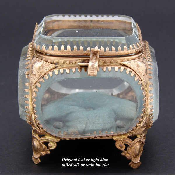 Lovely antique French Napoleon III or Victorian era 2.5" jewel casket or miniature vitrine, a lovely little box with thick beveled glass on top and all four sides, set in a rich gold or gilded pressed brass framework! Surely a souvenir of some sort and similar to the small French pocket watch caskets that we've had in the past though there is no place or region inscription on this one. Great to display a fine antique or heirloom pocket watch, pendant, treasured piece of jewelry or whatever your heart desires...