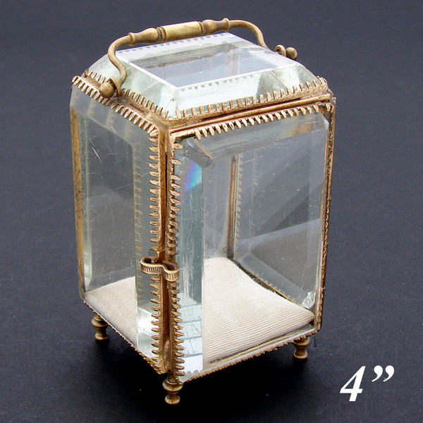 Charming antique French Napoleon III or Victorian era pocket watch or pendant display casket or miniature vitrine, a lovely little box with thick beveled glass set in a rich gold or gilded pressed brass framework!  Referred to as a "porte montre" in France, an item whose sole purpose is to beautifully display your timepiece when not in use.  Of course, it could also be used to display a treasured pendant or smaller portrait miniature or even religious relic.  This one has no hook mounted in the upper rear of the interior so keep that in mind.  Surely a souvenir of some sort and similar to the small French pocket watch caskets that we've had in the past though there is no place or region inscription on this one.  Great to display a fine antique or heirloom pocket watch or pendant.