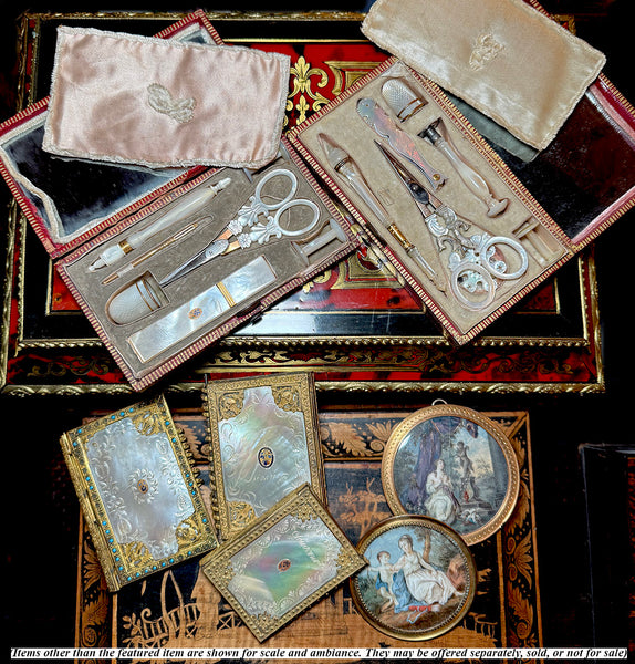 These sets are so hard to source these days. In museums or private collections, one rarely finds a full complete set in fine condition. The set you see is all original to its case, and includes the 2 thread spools and the crochet hook or tambour, as well as the more usual pieces: scissors, thimble, needle case and 18k gold bodkin (ribbon threading needle). Each piece is trimmed in 18k yellow gold, and the needle case still has the little oval 18k gold and enameled Palais Royal signature cartouche. There is a recess for one on the thimble, but that one has gone missing. The other missing piece would be a 1" carved snowflake silk winder, recess for which is beneath the scissors. I just never break a set apart as some do. Sadly, there is high value in individual pieces, and often the case is damaged beyond repair and thrown away.