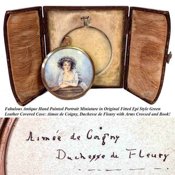 Fabulous antique hand painted portrait miniature in original fitted episode style green leather covered case, an ID'd depiction of Aimee de Coigny, Duchess de Deury with fine jewelry, arms crossed and a book at her side!  A delightful, colorful little painting and still in its original case!  No signature on the front but the backing has handwritten text that identifies the sitter and also states that the artist is Eve Pierrepont or Piercepont(sp?) and painted in 1905 from/apres a miniature on an antique snuff box.  Wonderful!