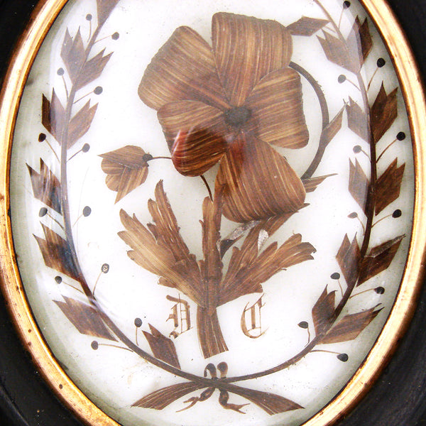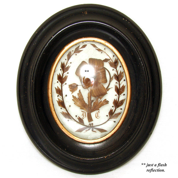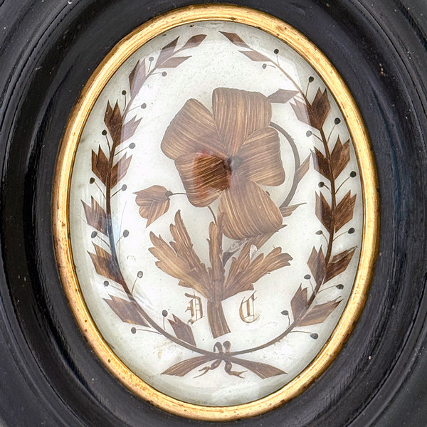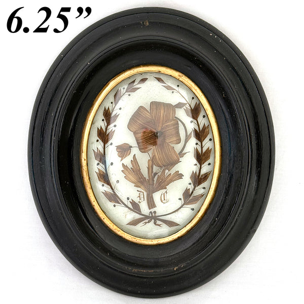 Rare antique French Napoleon III era hair art mourning icon or memento, displayed in an oval ebonized wood bombe style frame and featuring a large woven hair flower, foliate garland and “DC” inscrition!