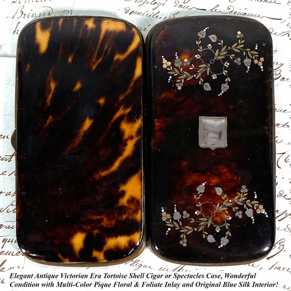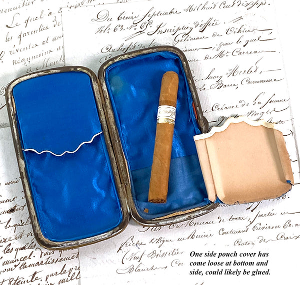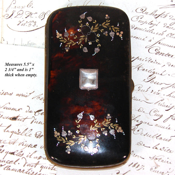 Very good condition, with a slight lift to the silver cartouche that centers the front and onto which monogram might be engraved. No other rises to inlays of pique work in tri color metal. The case top has missing abalone or mother of pearl inlays which would have been shaped like flowers (4) and which are clearly noted in our images. Clasp and hinge work perfectly and interior's original silk lining is clean and in fine shape, too. The Interior retains the original royal blue silk or satin lining & pockets. One pocket has separated from the side but we might be able to repair it with a little glue and will update the listing if so. See images for measurements.