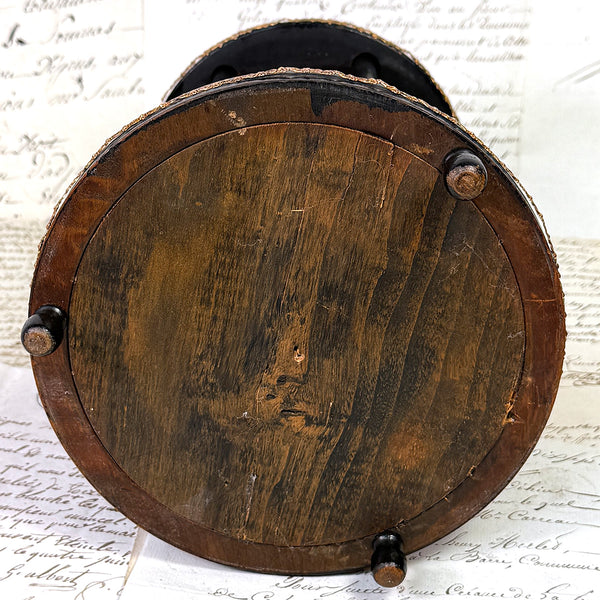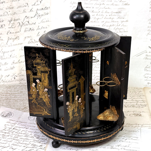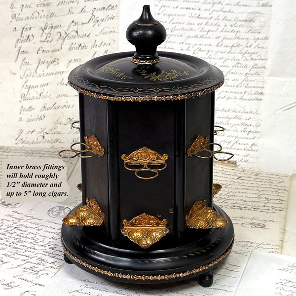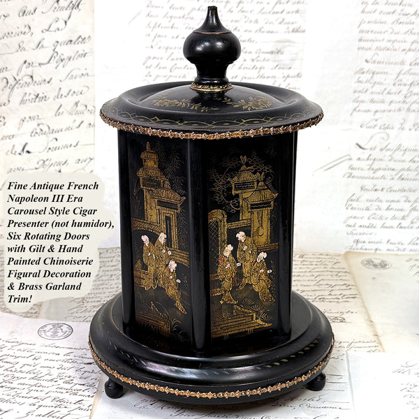 Fine antique 19th century Napoleon III or Victorian era cigar caddy or presenter, a mechanical carousel style casket (not a humidor) in ebonized wood with hand painted Chinoiserie figural decoration, six rotating doors that hold three cigars or cigarillos each and a pressed brass or gilt ormolu bands top & bottom! Normally we find these (when we're lucky enough to) with problems rotating the doors but this one works just about as good as could be hoped for though sometimes the doors need just a slight nudge to fully open or close. Chinoiserie style and these were Europe's answer to the Oriental lacquer pieces. On display around the world, including the room dedicated to Victorian papier mache goods displayed in the Musee des Arts Decoratif in a wing of the Louvre (Paris). This one not quite so grand as those with hand painted gold architectural structures or pagodas & figures but elegant in its own right and these cigar presenters really do make lovely decorative pieces. One of just a few that we'll be listing in the next weeks so be sure to browse a bit while you're with us. Thanks!