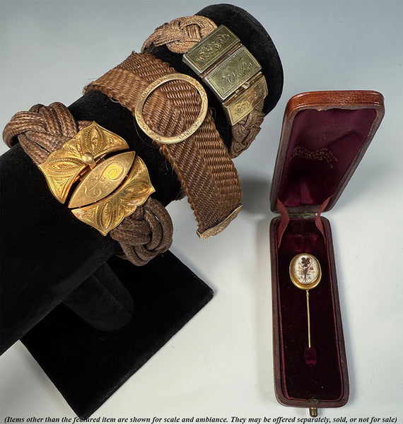 Antique Victorian Era Mourning Bracelet, Large 16k Clasp and Tightly Braided Chestnut Hair Art