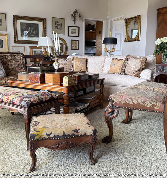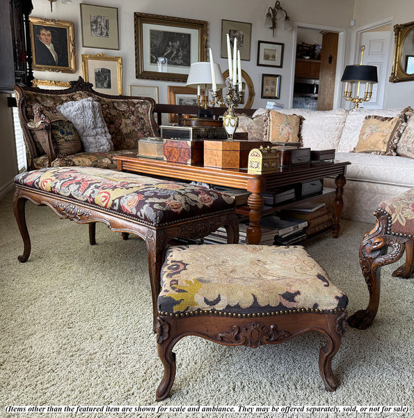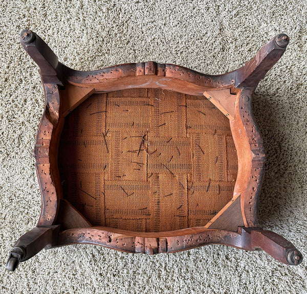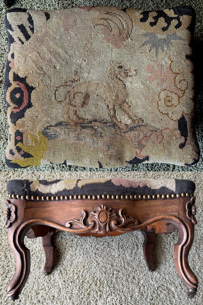 The carving on this one is marvelous and undamaged. Intricately carved and beautifully preserved (note: needlepoint has a few flaws to mend). Thick wood and very sturdy, the legs once had wheels (1 left on to show you) but I think it's best if the small hardware is removed. Can't think of a need for a footstool to have wheels, but it was in fashion in c.1840-60 when this was created. I have not polished nor treated the wood so you could see any imperfections, but we will do so to cover them up nicely before sending out to you. Large, 19" x 15.75" and 11.5" tall.