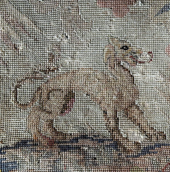 Very good to excellent condition for age and type, the primary flaws would be the missing 3 original wheels, a few rubs to wood which can be stained, lightly waxed and easily restored, and last, the Griffen or lion needlepoint panel has a few moth nibbles and one can either love it as it is (I do), or match wool yarn and do a tiny bit of needlepoint restoration/restitching. The canvas is strong and uncut. Very easy to do this one.