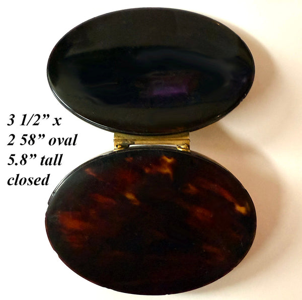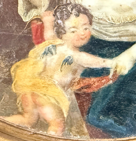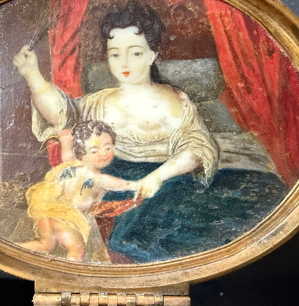 Spectacular and rare finely crafter tortoise shell box which one might expect to be a snuff box, but it is the hiding place of a sensual or 'naughty' oil painting. A beautiful young woman, breasts bare, sits upon her bed and takes a willow switch to the backside of cupid who smiles mischievously in spite of his reddened bare bum. He still holds his bow, and his tiny wings remain evident. It is a story of a reluctant and perhaps regretful young beauty who has been enticed by cupid to make a love choice she's unhappy with, even if only playfully so. Gentlemen often carried such an item as this, brought out at gaming nights, or perhaps kept as image of their mistress to be admired in secret. I've always loved portrait miniatures, and been intrigued by these naughty ones. Full measurements are noted on the photos.