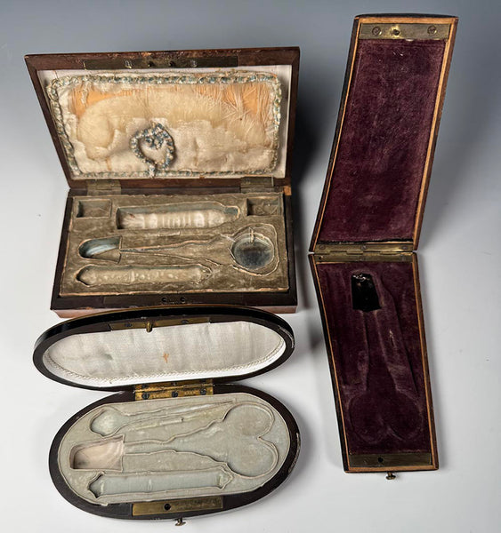 Very good to excellent condition for age and type, perfect to repurpose as jewelry boxes, or to show off your micro mosaic collection, or brooches, pocket watches, etc., resting half open. No warp, and pushbutton latches and hinges work perfectly. Handle on the very oldest rectangular one is missing. Interiors as shown. Very nice boxes, being offered together as a lot of 3, as shown.