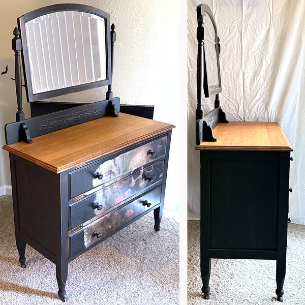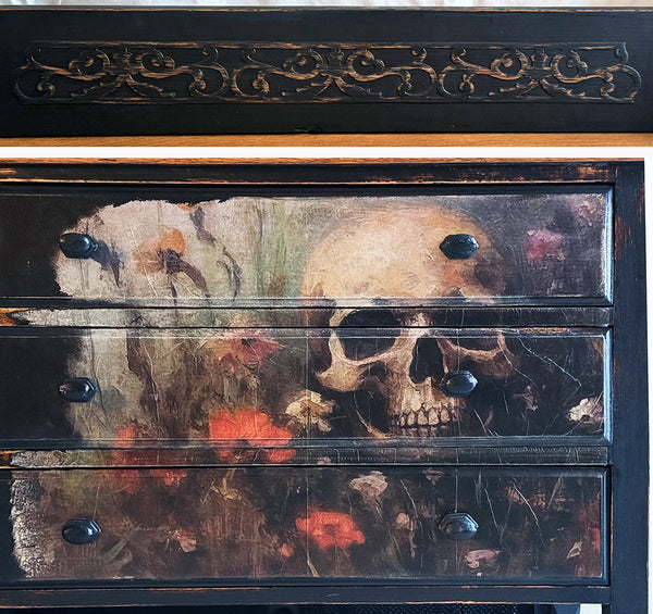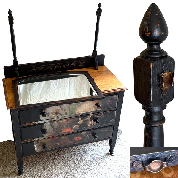 One-of-a-Kind SUMMERWEEN Halloween Antique Victorian Dresser with Beveled Mirror, Decoupage Skull Facade & Distressed Black Finish