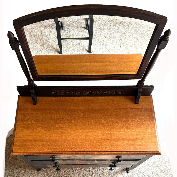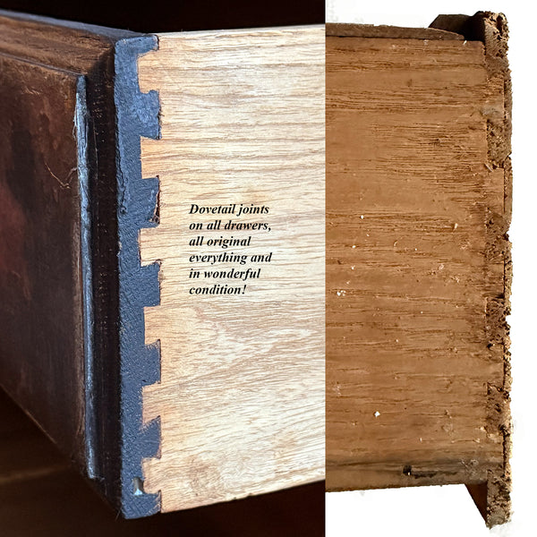 Very good condition.  The drawers stick a little but are complete and all original.  The casters are all intact but they don't roll easily, at least not on carpet which is where it sits and where it was photographed.  A few replaced screws visible on the back (mirror support) but, as you can see, this one is in great shape for its 100+ years and the restoration/alteration really is fantastic!  See images for all measurements.