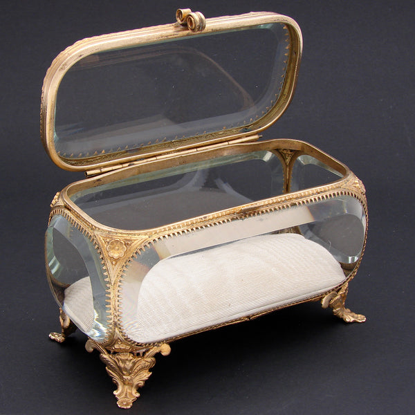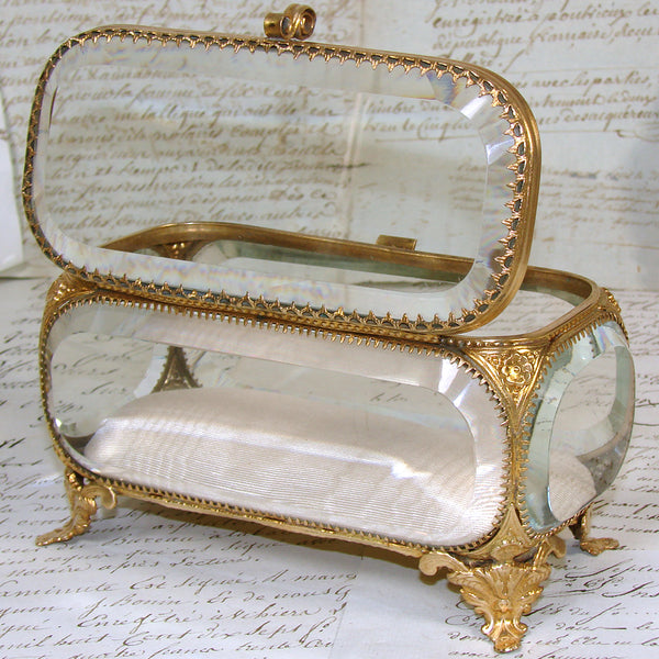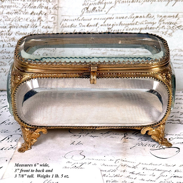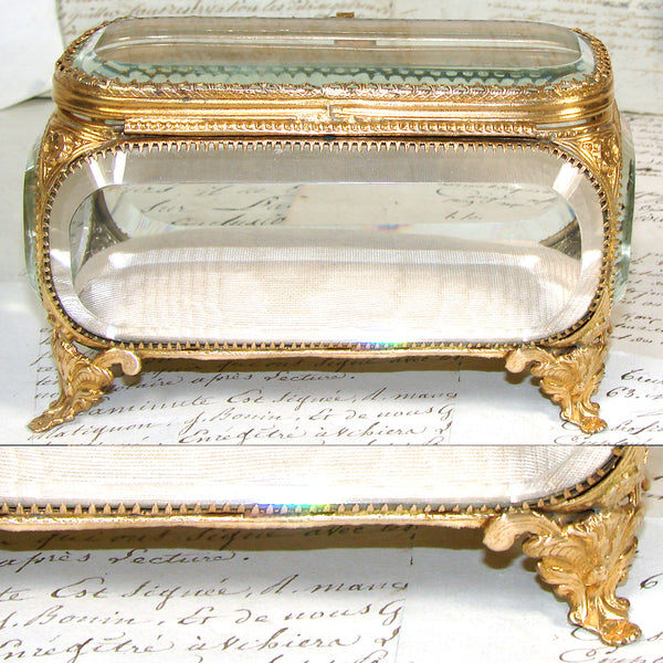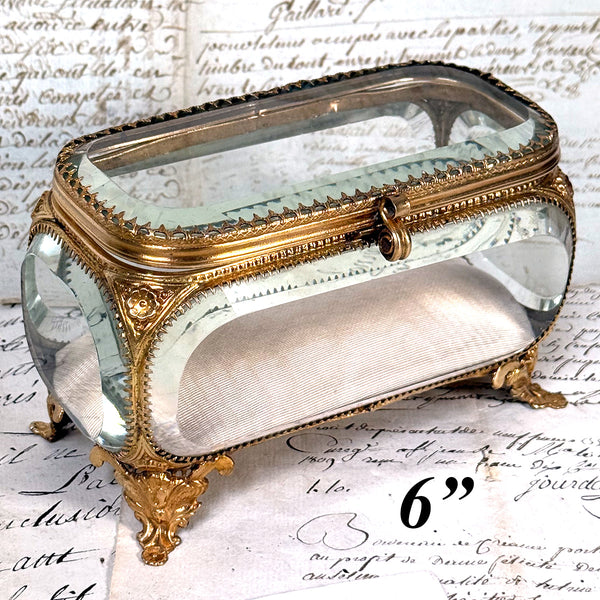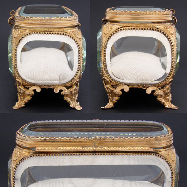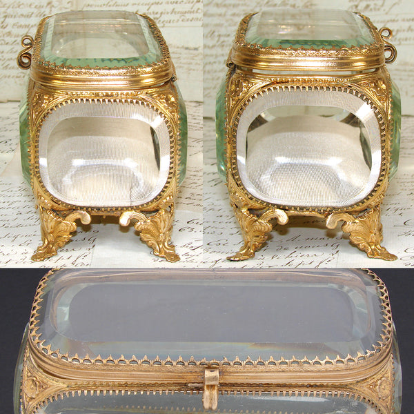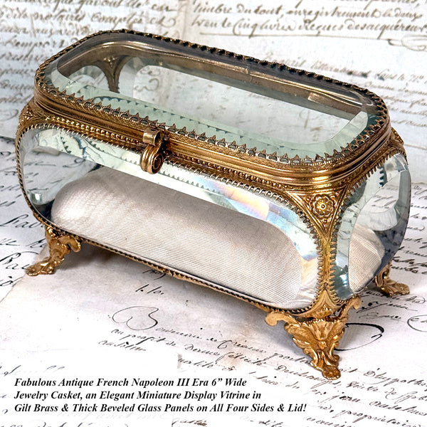 Fabulous antique French Napoleon III era 6" wide jewelry casket, an elegant miniature display box or vitrine in gilt brass with thick beveled glass panels on all four sides & lid!