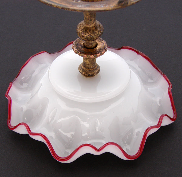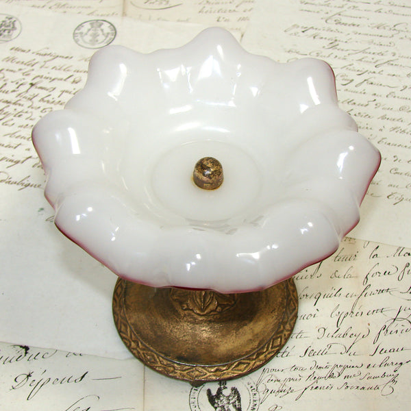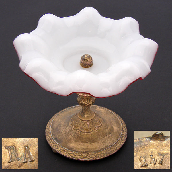 Lovely antique Victorian to early Edwardian era 5.75" tazza, bonbon or candies dish with shaped or ruffled & red rimmed white opaline dish on a gilded metal base!  I've tried looking up the markings on this one but with no luck, it's likely of American origins as they're similar to those of Jennings Brothers.  A fine piece and rather amazing that the glass dish has survived with literally no flaws.  The gilt base/stand does show its age but all is original, intact and would make a fabulous desk top candies dish though the uses are really only limited by your imagination.