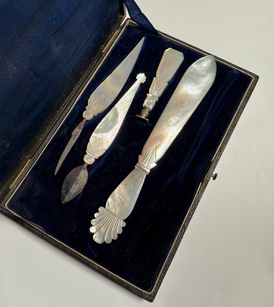 Fine Napoleon Era Palais Royal Carved Mother of Pearl Writer's Tool Set, Wax Seal, Letter Opener