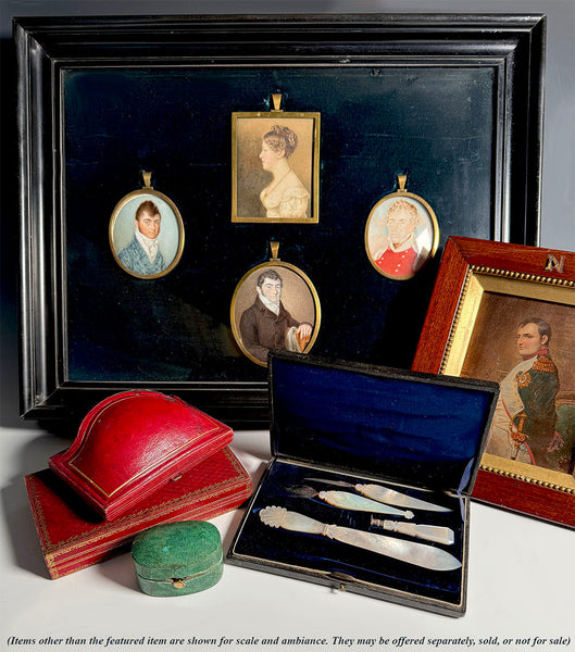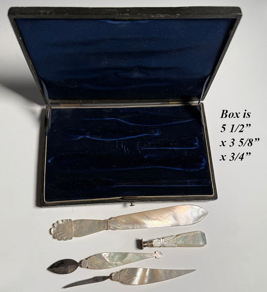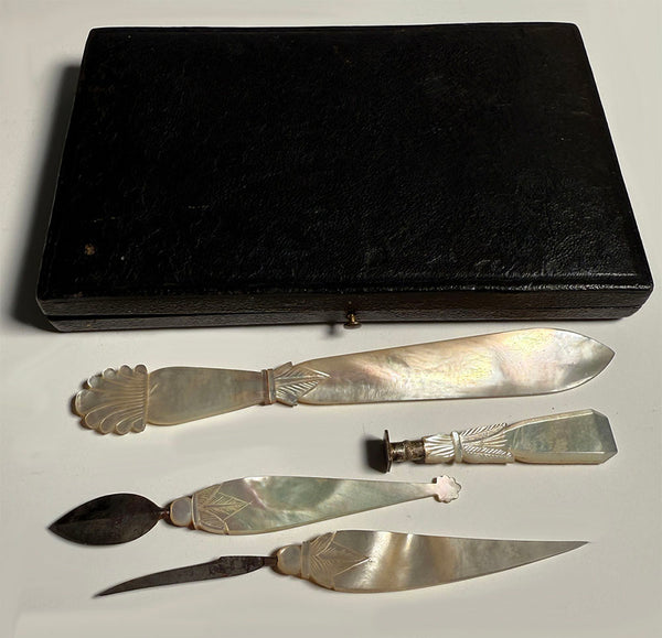 Earliest 1800s carved mother of pearl set for the writer, missing only the original dip pen. One can certain replace that one item with a more easily found French mother of pearl dip pen. What you have remaining in the original fitted box, necessaire, are these: letter opener, wax seal (matrix not yet engraved), quill blade and the scraping 'eraser' tool. The leather case remains in beautiful condition for age, as do the 4 desk set implements. Full measurements noted on photos.
