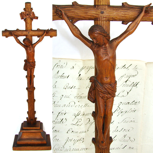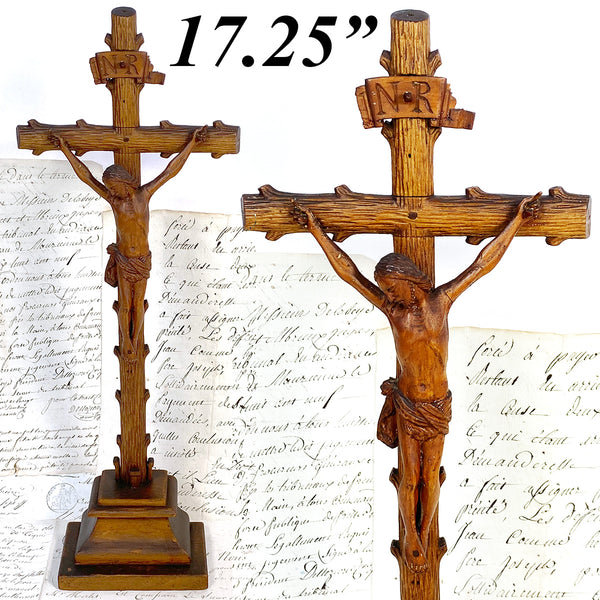 Fine Antique 17" Hand Carved Black Forest Style Crucifix, Expired Christ or Corpus, INRI Plaque