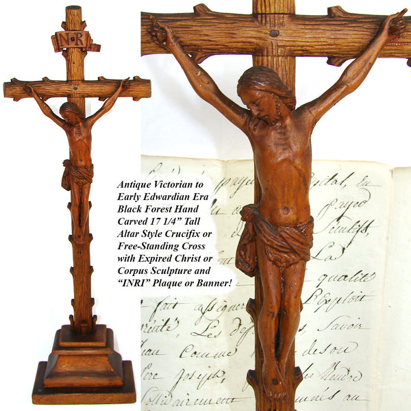 Fine antique Victorian to early Edwardian era 17 1/4" tall hand carved Black Forest style cross or crucifix with lighter wood finish, expired Christ or corpus figure and "INRI" pique or scroll above!  Never have been involved in an organized religion, the love, care and artistic aspects put into these pieces has always been alluring.  Seeing similar works on display in museums worldwide, not to mention all of the magnificent old cathedrals spread throughout.  You don't have to be a part of the religious to truly appreciate all of these fantastic old religious works of art.  This one an altar or freestanding display piece.  Devotional or decorative, they still possess some sort of power.