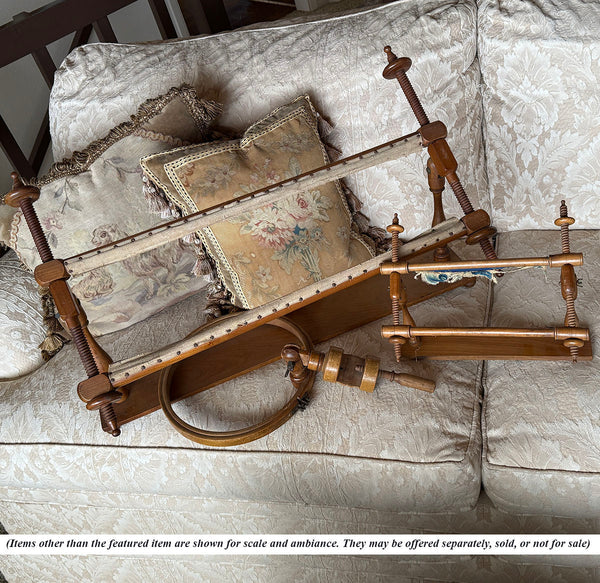 In from France along with some table/lap and free-standing antique French embroidery and/or needlework, quilting frames, this is the smaller of the ones we've had, and is a tabletop mount or clamp style. The hoop is 10" ini diameter, a nice size for working manageable sections of needlework. Complete and simple to work with, it's a beautiful old wood hoop ready to put to use, or to frame and display older pieces of needlework, or tapestry. If does fold so handle length crosses over the hoop, more compact for storage and shipping. Full measurements noted on photos.
