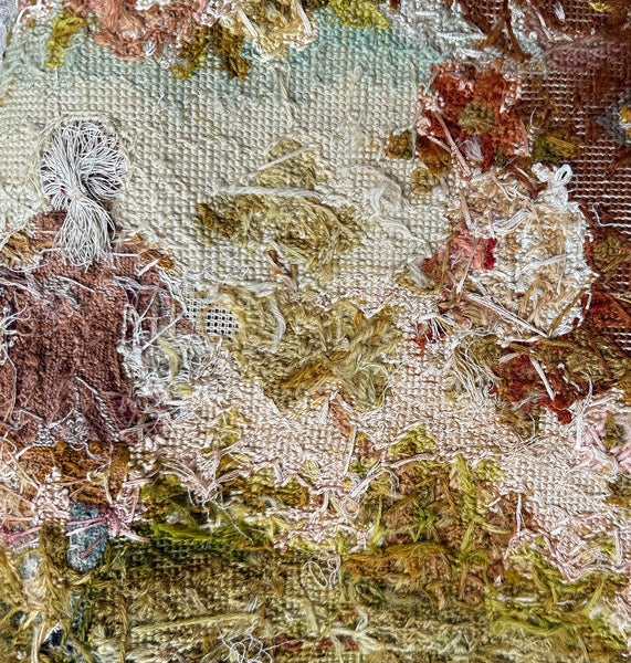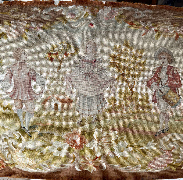 Antique French Romantic Era Needlepoint 43" x 23" Panel with 3 18th c. Figures, Country Setting
