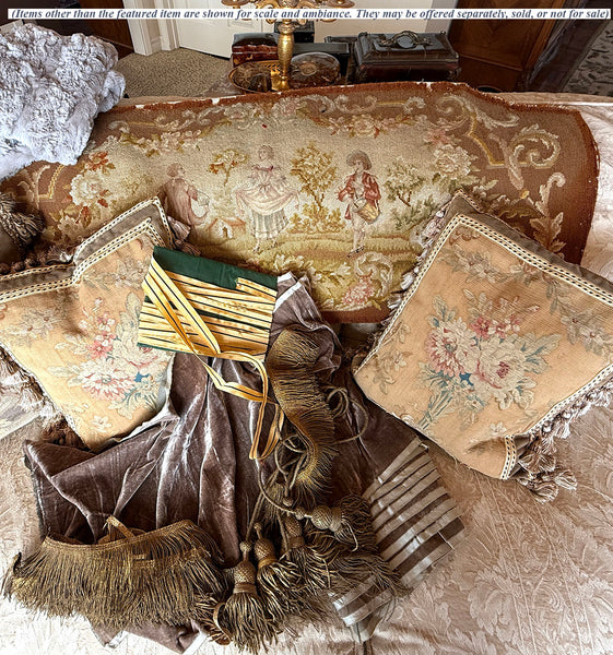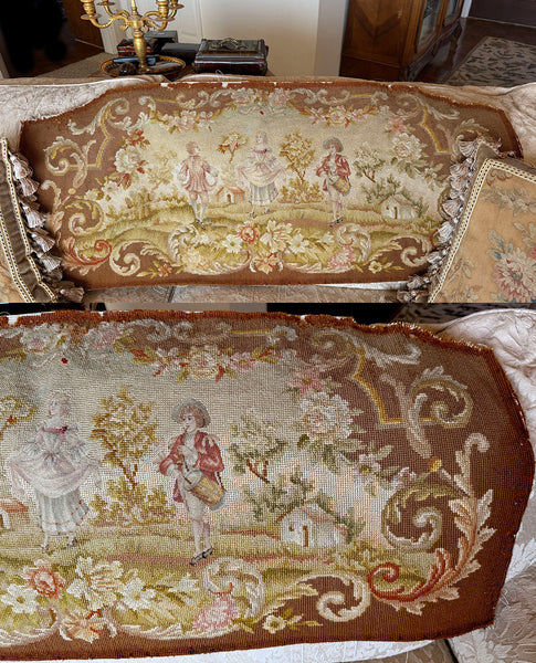Fabulous Antique French Romantic era needlepoint 43" x 23" panel which was made for the upholstered backrest to a loveseat or settee! I'd date it c. 1850-1900 based on style of needlework and the pattern, which recalls the 1700s Romantic Era fashions and genre. Fine embroidery work in wool and silk, it is excellent and ready to live again as a lushly-fringed/trimmed out decorator throw pillow pair (cut in half), or a long bolster pillow Again, from my stash of best panels collected over decades, all of which I'm trying to part with now, a batch at a time. You'll want to mix/match to put together your own decorator dream grouping of pillows. Every decorator magazine shows them now, from modern decor to antique. Simple project, really, or get your local upholstery shop to put it together. It's so fun! Full measurements noted on the photos but will add here: 42" long with a slightly arched top so it is 23" at center and tapers to 15.5" tall at each side. Perfect size for a large bolster or bed pillow as it is, or you can make a center cut and create a matching pair of pillows. You might even finish it as a wall hanging. Be creative!