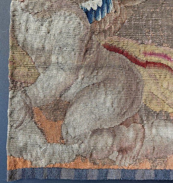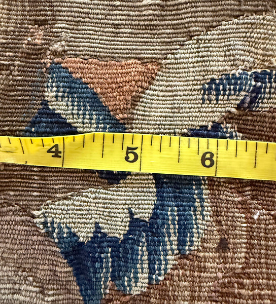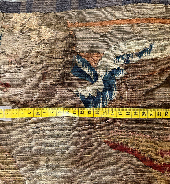 I only buy the very best tapestry panels - here is another from my private stash, collected over decades of buying in Europe. This panel would be 17th century, and presents in exceptionally fine and professionally restored perfection, linen backed and ready for you to make up into a magnificent decorator throw pillow, or to hang on the wall as the art it truly is. As you know, figural tapestry fragments are rare, and as you can see this one is just superb. I bought it for myself, but it's time to share. We have a good selection up now for you to mix-match and thrill your decor. Full measurements are noted on the photos, but it is 17" tall and 15" wide, very fine yarns in wool and silk. I've placed a ruler on it so you can see how early and fine the loom work truly is. A museum piece!
