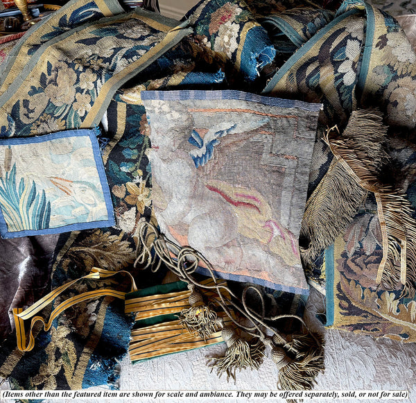 Very good to excellent condition throughout. If it needed any restoration, it's been professionally done. No holes, no losses, a fragment from a huge and opulent tapestry of great worth. Hang as art, or frame it, or as I had intended, make it up into a luxurious down-filled and lushly trimmed decorator throw pillow. Such a simple project, but one I'm not going to get done, I'm afraid. Your gain!