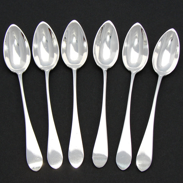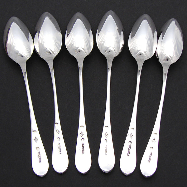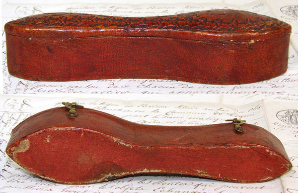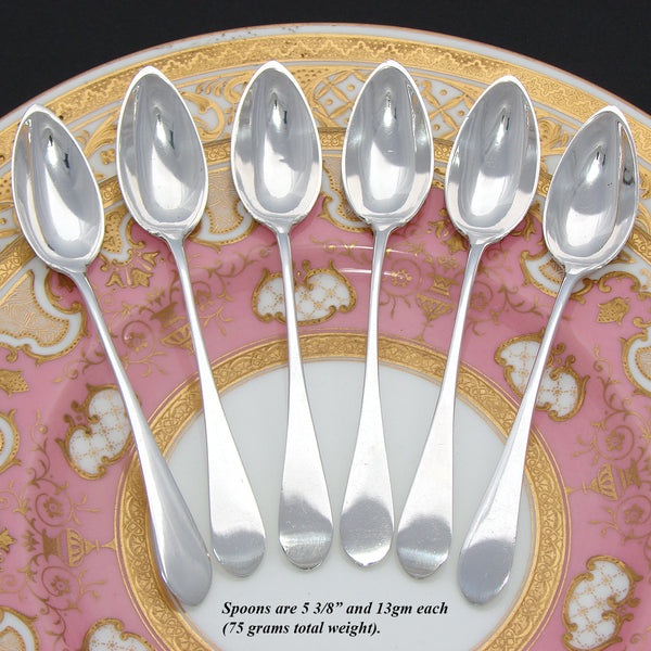 Elegant antique French sterling silver 6pc teaspoon set with sleek, nearly mirrored pattern and uniquely shaped embossed or tooled brown leather travel style box, case or etui! This type of antique French sterling silver travel set is far more than just a collection of teaspoons; it is a meticulously crafted artifact that tells a story of social status, personal hygiene, and the emerging culture of leisure in 19th-century France. The spoons with the older pointed tip bowls, all with a sleek, simple but elegant shaping sans monograms. All bear the French Coq hallmark dating them between 1789-1809 and the tiny number "1" (somewhat obscured) within those marks means they're in .950 silver (95% pure and so just above the .925 standard for "sterling" silver. I haven't found reference for the silversmith marks "Hornus" but will add that information if/when I find it.