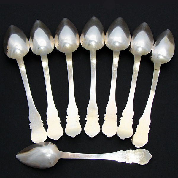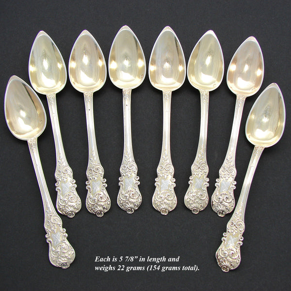 Antique French 18k on Sterling Silver Vermeil 8pc Teaspoon Set, Ornate Pattern & Shaped Leather Box, Etui