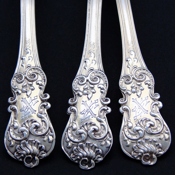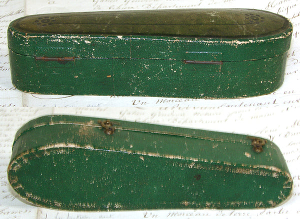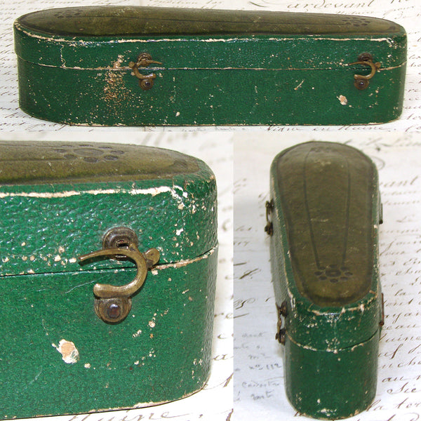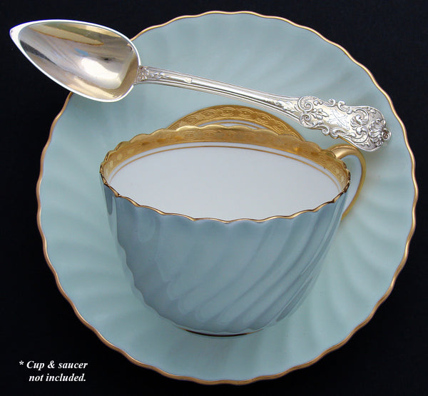 Elegant antique French 18k gold on sterling silver "vermeil" 8pc teaspoon set with ornate pattern, interlaced monograms and tooled or embossed green leatherette travel style box, case or etui!  This type of antique French sterling silver travel set is far more than just a collection of teaspoons; it is a meticulously crafted artifact that tells a story of social status, personal hygiene, and the emerging culture of leisure in 19th-century France.  The spoons with the older pointed tip bowls, scrolling pattern and unique interlaced monogram that I can't quite decipher.  All bear the French Minerve or Minerva hallmark, the tiny number "1" within those marks means they're in .950 silver under the remnants of the gold plating (95% pure and so just above the .925 standard for "sterling" silver.  I somehow missed adding images of the hallmarks but will do so as soon as I'm able.