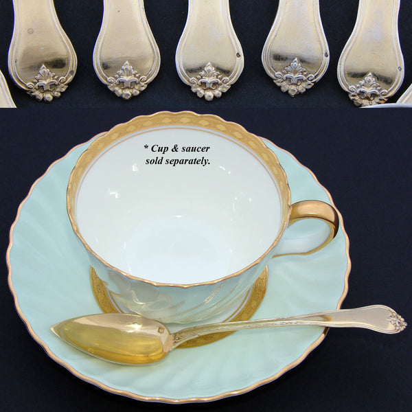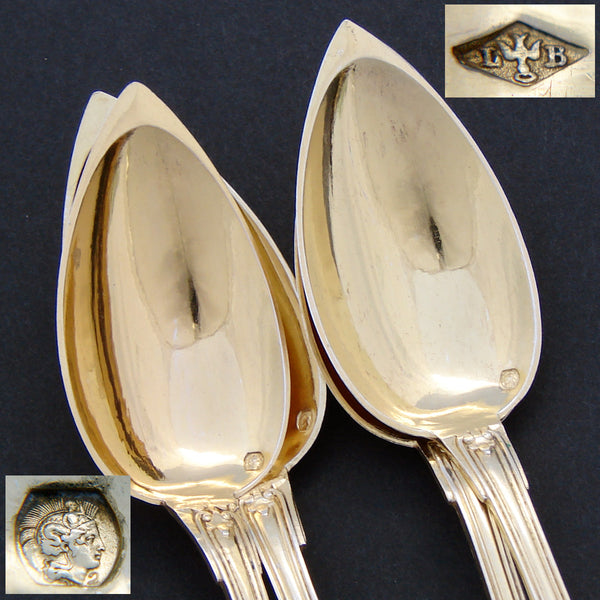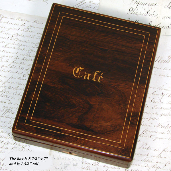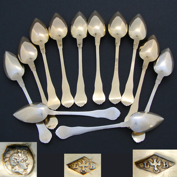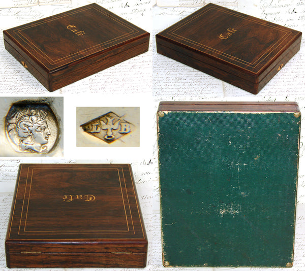 Wonderful antique French gold plated .800 (nearly sterling) silver "vermeil" 12pc coffee or teaspoon set with lovely floral or acanthus accented pattern in a gorgeous Napoleon III era "Cafe" inlaid rosewood storage and/or presentation box! One of a few elegant old French sterling & vermeil teaspoon sets that we've added recently. Fabulous service pieces and an undeniable history of opulence, dare we say extravagance? All twelve spoons bear the French Minerve or Minerva hallmark, the curved outer shape of the mark and the tiny number "2" within designates them as being in .800 silver (80% pure so just under the .925 standard for "sterling" silver). The silversmith is easily legible, "LB" with a dove holding what appears to be a halo, but I've not been able to identify them as of listing. The box as elegant as can be, veneered in a beautiful, richly grained rosewood with likely fruitwood strip or string inlays including a "Cafe" cartouche.