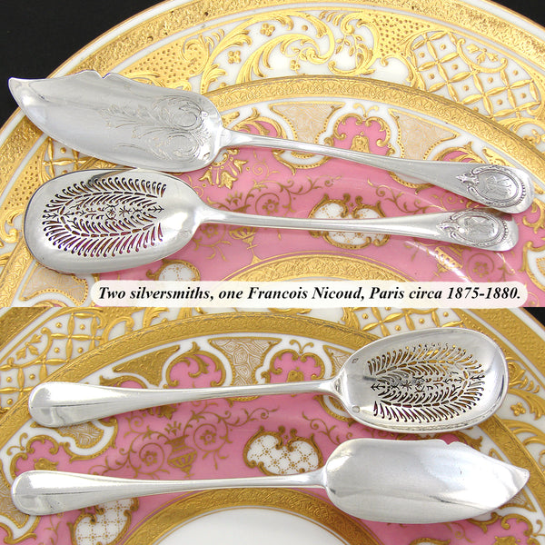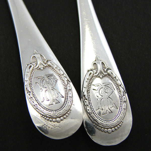 Elegant antique French hallmarked sterling silver 2pc condiment or hors d'oeuvres serving set with gorgeous raised medallions, interlaced "TR" or "RT" monograms and wonderful condition!  Yes, only a two piece set but you simply have to love them.  Both bear the French Minerve or Minerva hallmark, the tiny number "1" in the upper right corner means they're in .950 silver (95% pure and above the .925 standard for "sterling" silver).  Rather unique in that each piece has a different silversmith mark, one "T.M." with crown (that I haven't found reference for) and the other for Francois Nicoud, Paris circa 1875-1880.  I've included enlarged photos, including of the medallions, so look and enjoy.